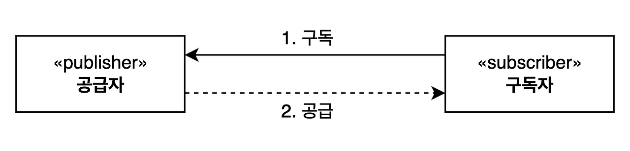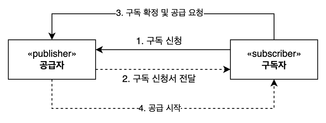 Subscriber(이하 구독자)가 구독(subcribe)하면 Publisher(공급자)는 구독자가 요청한 데이터(이벤트, 신호 등등)를 제공한다. 어떤 데이터를 언제 제공할지는 주로 서비스 공급자의 정한 규칙(구현)에 따른다. 하지만 구독에 관한 내용을 모두 공급자가 정하는 것은 아니다.