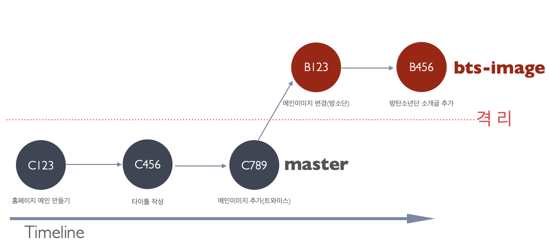 master로 이동해서 커밋로그를 확인해보자. bts-image 브랜치에서 추가한 로그가 보이지 않는다.