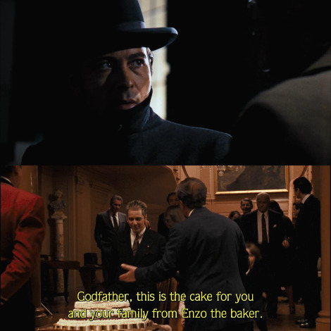 3편의 초반 파티에서 축하 케익을 만든 곳이 바로 엔조 베이커리다(저 말을 하는 남자가 엔조인지는 확실하지 않아서 뒷모습만 보이게 했다). 패밀리에 큰 공을 세운 엔조를 마이클이 계속 밀어준 것으로 보인다. 젊을 적 은혜를 잊지 않고 늙어서까지 챙겨주는 꼴레오네 패밀리…