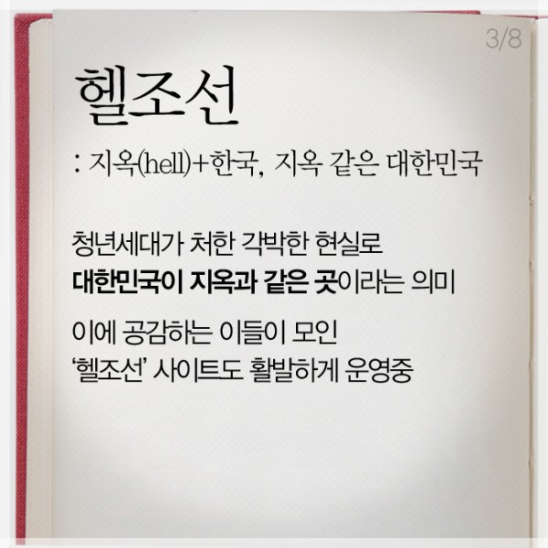 하지만 좌절하지 말고, 다른 방향으로 나아가 보았다. 어쨌거나 ‘헬조선’이라는 매우 극화된 단어가 쓰이게 된 건 최근부터다. 정확히 알 순 없지만 2015년 즈음부터 조금씩 쓰이기 시작하던 이 단어는 어느 순간부터 방송·신문 등에서까지 사용하는, 모두에게 통용되는 용어가 되었다. 그전에 쓰이던 사회 용어들은 88만 원 세대, N포 세대 등 특정 세대나 집단을 지칭하던 것들이 많았다. 하지만 이후 급격히 부상한 수저계급론은 아예 사회 전체를 가리키더니 국가 자체를 통칭하는 헬조선이 되었다.
