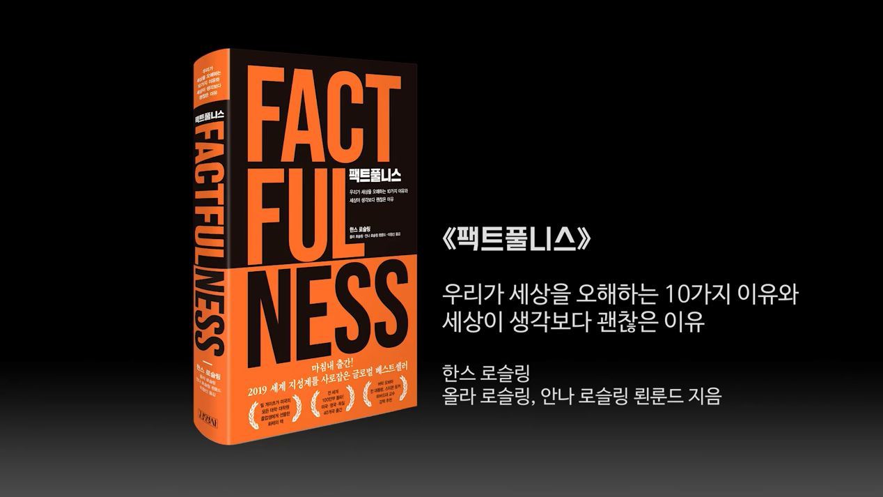 기본적으로 이 책은 전 세계를 기준으로 하니 모든 걸 그대로 적용할 수는 없다. 당연히 관련 지표는 거의 모든 면에서 현재의 한국이 압도한다. 우리나라는 1960년 이후로 말도 안 되는 속도로 성장을 일궈냈기에 그때와 지금의 한국을 비교하는 건 의미가 없는 셈이다. <팩트풀니스>에서 우리가 오해하고 있던 나라들과도 그 발전이 비교가 전혀 안 된다. <팩트풀니스>의 사례로도 못 쓰일 정도다.