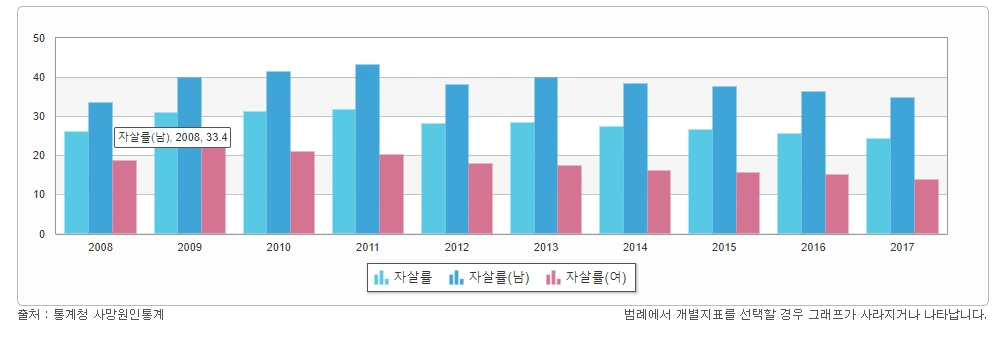 한국의 자살률은 굳이 설명할 필요가 없다. 2003년부터 10년 넘게 OECD 자살률 1위를 하다가 드디어 작년에 리투아니아(십만 명당 자살률 26.7명)가 OECD에 가입하면서 1위 자리를 내줬다. 하지만 이 두 나라만 유일하게 자살률 25명을 넘기는 국가이고, 3위부터는 18.1명으로 내려간다(OECD의 최신 자료는 아직 2016년까지고 우리나라의 경우 2015년 자료여서 아직 25.8명으로 되어 있다).