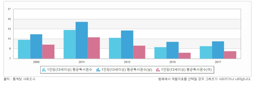 우리나라의 연간 독서량은 한 자릿수(9.5권)로 떨어진 상태로 낮다. 여기서 남녀 비율 또한 나타난다. 일반적으로 여자가 남자보다 독서를 많이 한다는 인식이 있다. 하지만 2009년부터 2년 간격으로 이뤄진 조사에 따르면 계속 남자가 여자보다 독서량이 많았다. 많을 땐 3권이나 차이가 났고, 꾸준히 2권 이상의 차이가 난다.
