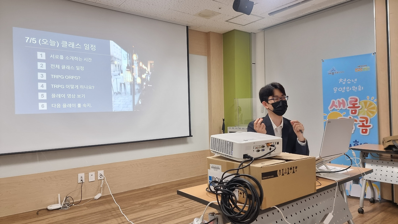 배. 저는 배준영입니다. 대학생이고요 학업으로 바쁜 와중에도 매주 수요일, 토요일, 목요일에 TRPG를 1년 정도 운영한 마스터기도 합니다. 보드게임 모임을 만들고 참여하며, TRPG 강의도 진행한 바 있습니다. 현재는 세종시를 테마로 한 보드게임도 제작 중입니다.