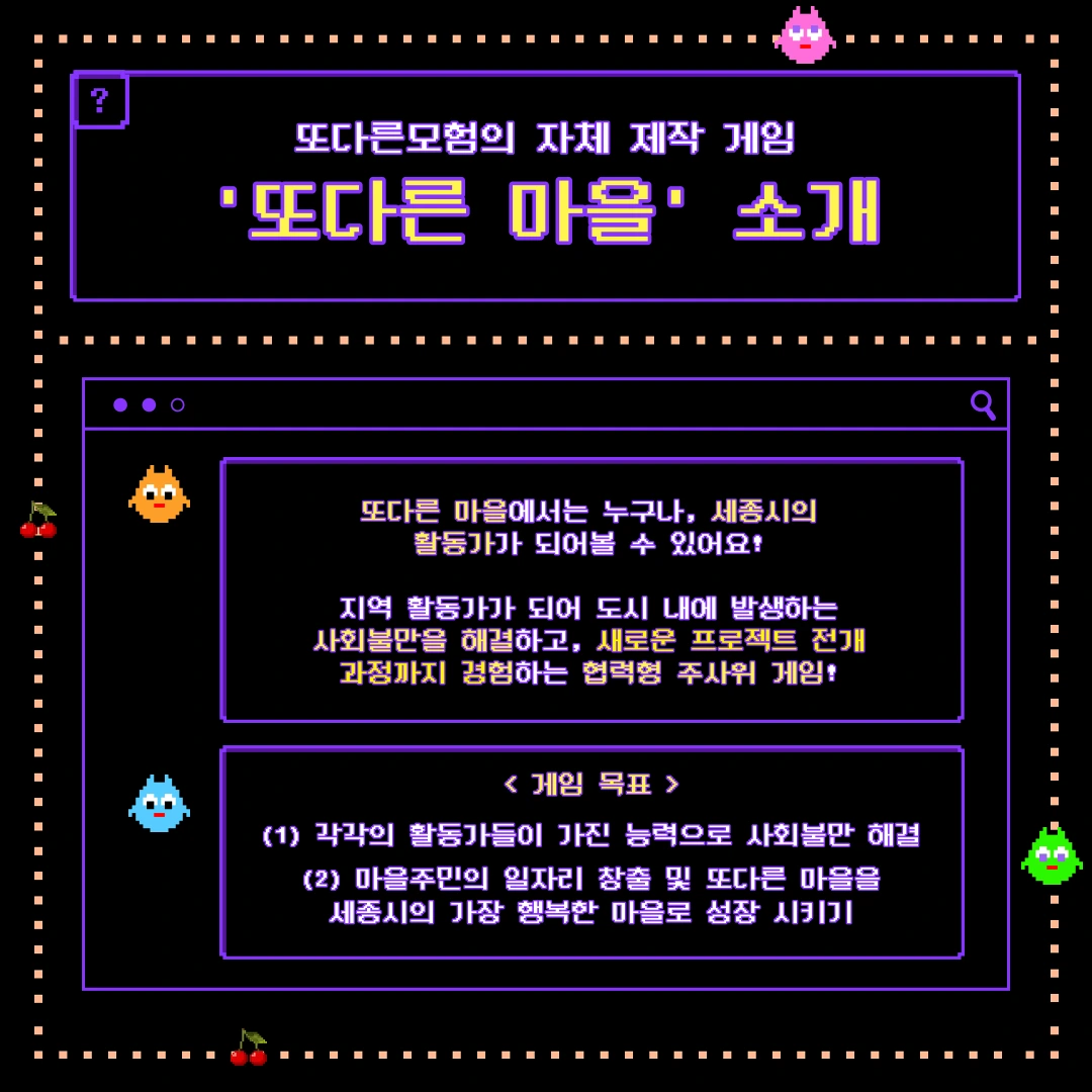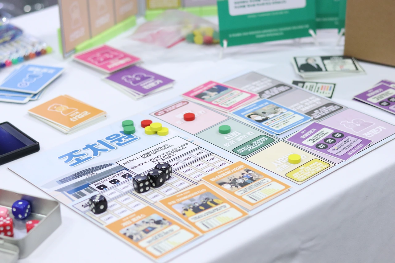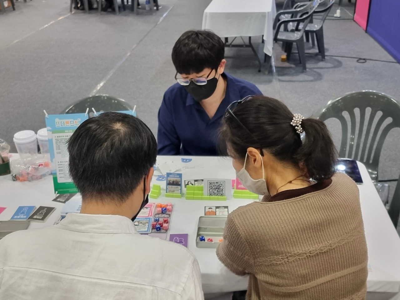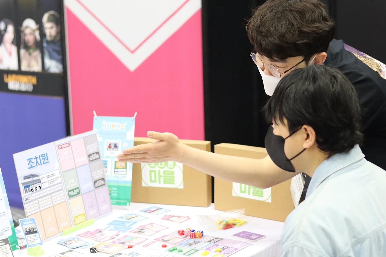 플레이엑스포에서는 또다른모험의 자체 제작 게임 '또다른 마을'을 선보였어요. '또다른 마을'은 플레이어가 지역 활동가가 되어 도시 내에 발생하는 사회불만을 해결하고, 새로운 프로젝트 전개 과정까지 경험할 수 있는 협력형 주사위 게임이에요. 게임의 목표는 다음과 같아요. 1) 각각의 활동가들이 가진 능력으로 사회불만 해결하기 2) 마을주민의 일자리 창출 및 또다른 마을을 세종시의 가장 행복한 마을로 성장 시키기