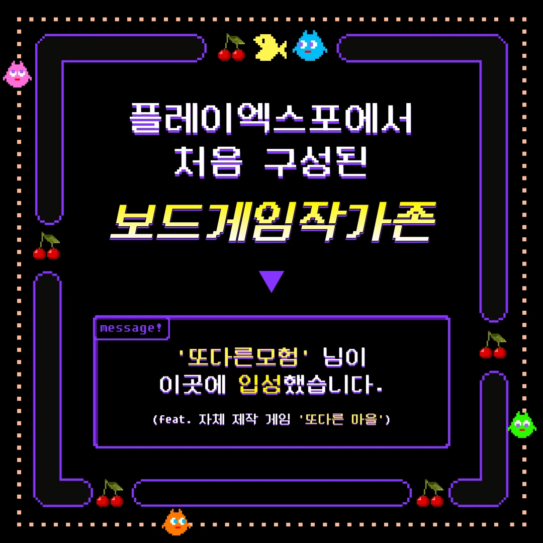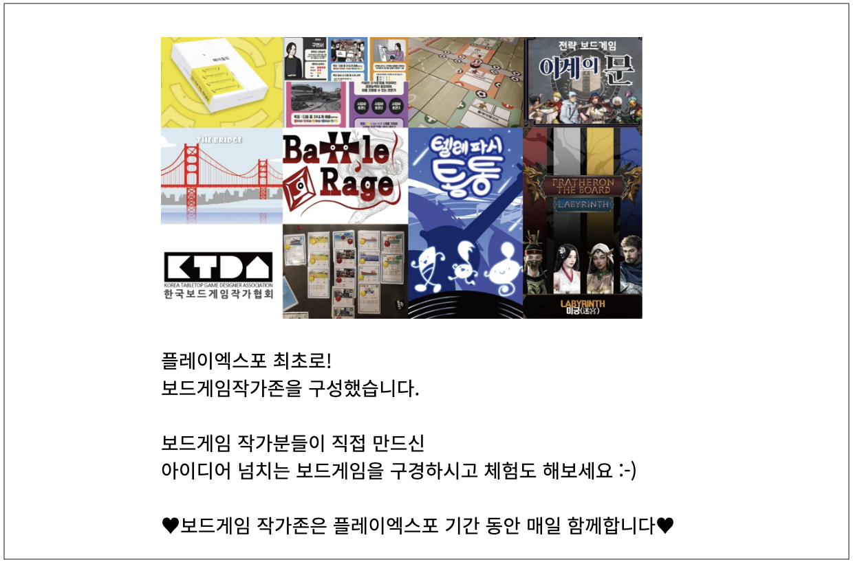 그리고 올해 처음, 플레이엑스포에 '보드게임작가존'이 생겨났는데요. 아래 사진 중 첫째줄 왼쪽에서 두번째! 또다른모험의 이미지가 들어가 있는 것, 보이시나요? 플레이엑스포의 최초 보드게임작가존에 또다른모험이 입성했습니다. 전국 보드게임작가 10개팀 중 한 팀으로 선정되었거든요!