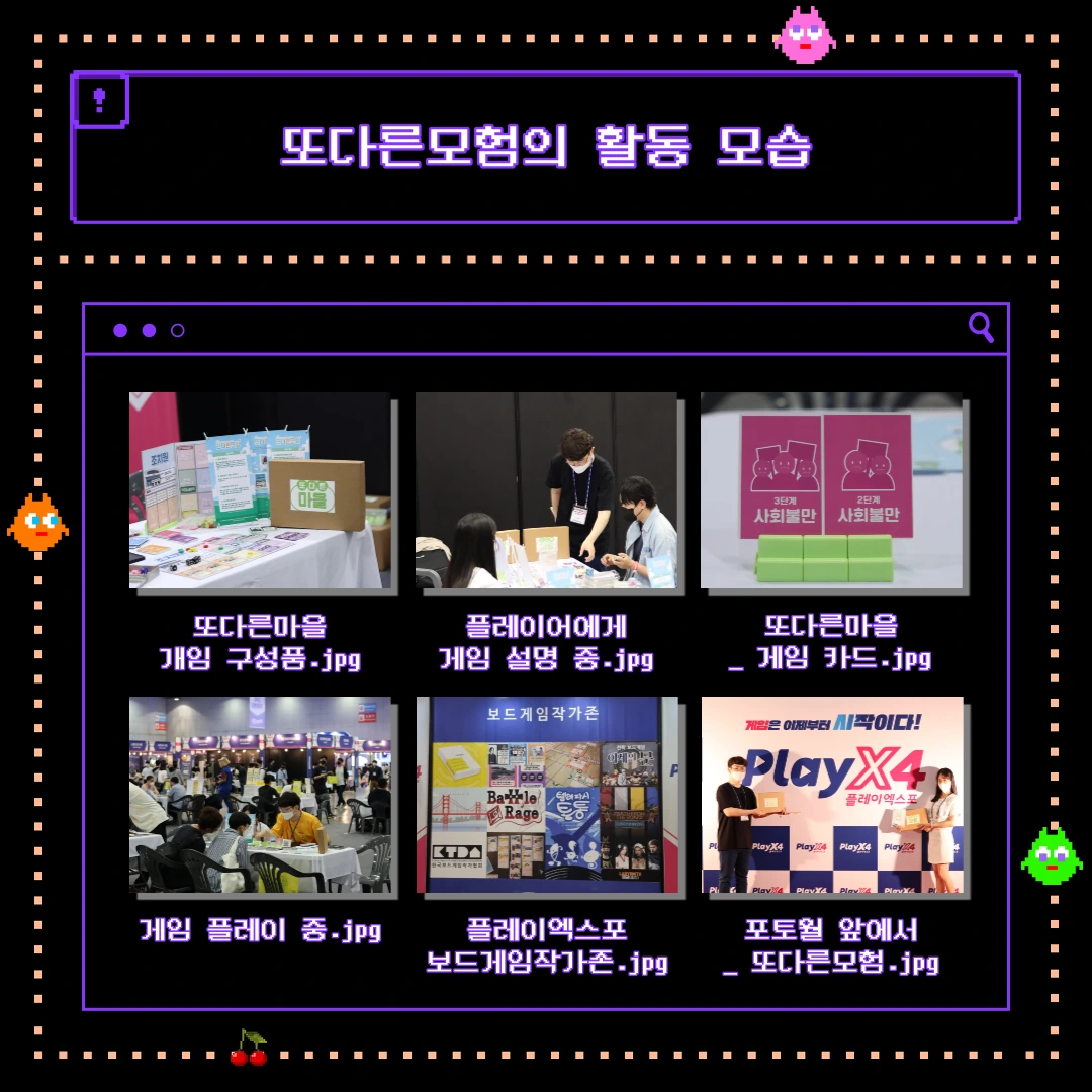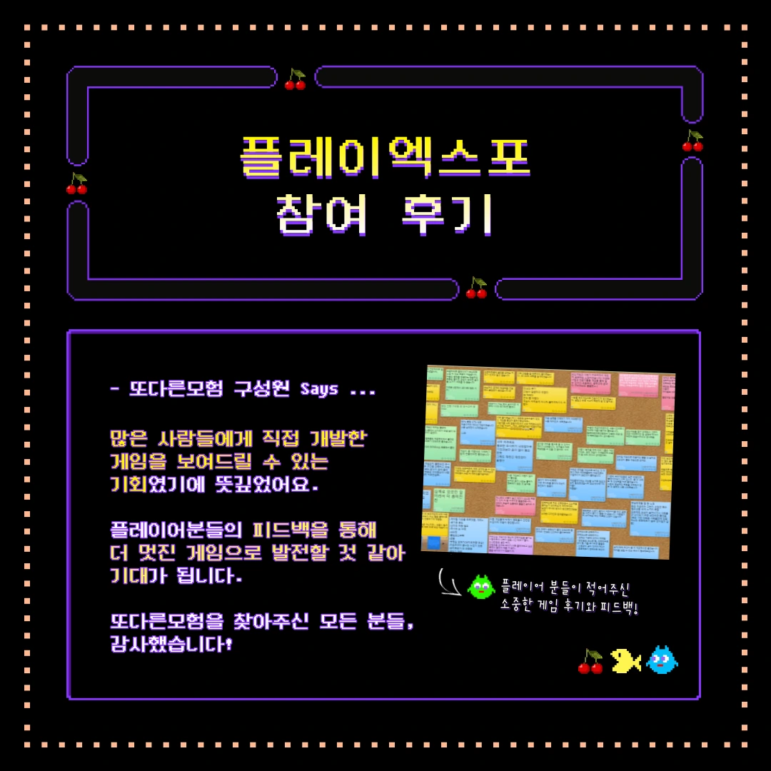 이렇게 또다른모험의 플레이엑스포 참여 후기를 전해드렸는데요. 많은 분들에게 자체 제작 게임을 선보일 수 있어 뜻깊었던 자리였어요. 더불어 '또다른 마을'이 더 멋진 게임으로 거듭날 것 같아 기대가 되기도 했답니다. 앞으로의 또다른모험의 여정에도 많은 관심 부탁드리며, 다음에 또 재밌는 소식을 들고 올게요! 안녕~!