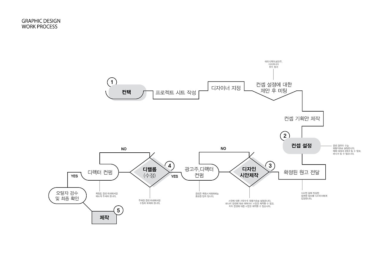 5. 수정단계: 컨셉이 확정된 이후의 수정에서는 *전체의 맥락 아래에서만 수정이 되어야 한다. 즉 *디테일적인 것에서만 수정이 이루어져야 한다는 것인데 만약에 이 단계에서 광고주의 마음이 달라져 최초의 기획과 달리 요청하거나, 컨셉이 달라지는 요청을 하면 또 다른 시안을 제작해야 하기 때문에 작업시간이 더욱 딜레이가 되며 서로 감정적으로도 힘들어지게 된다. 그래서 컨셉 확정 단계가 가장 중요하다는 것이다. 물론 추가 시안 제작 비용을 받고 디자인을 할 수는 있지만, 매우 비효율적이고 일정 또한 딜레이 될 수 있다.