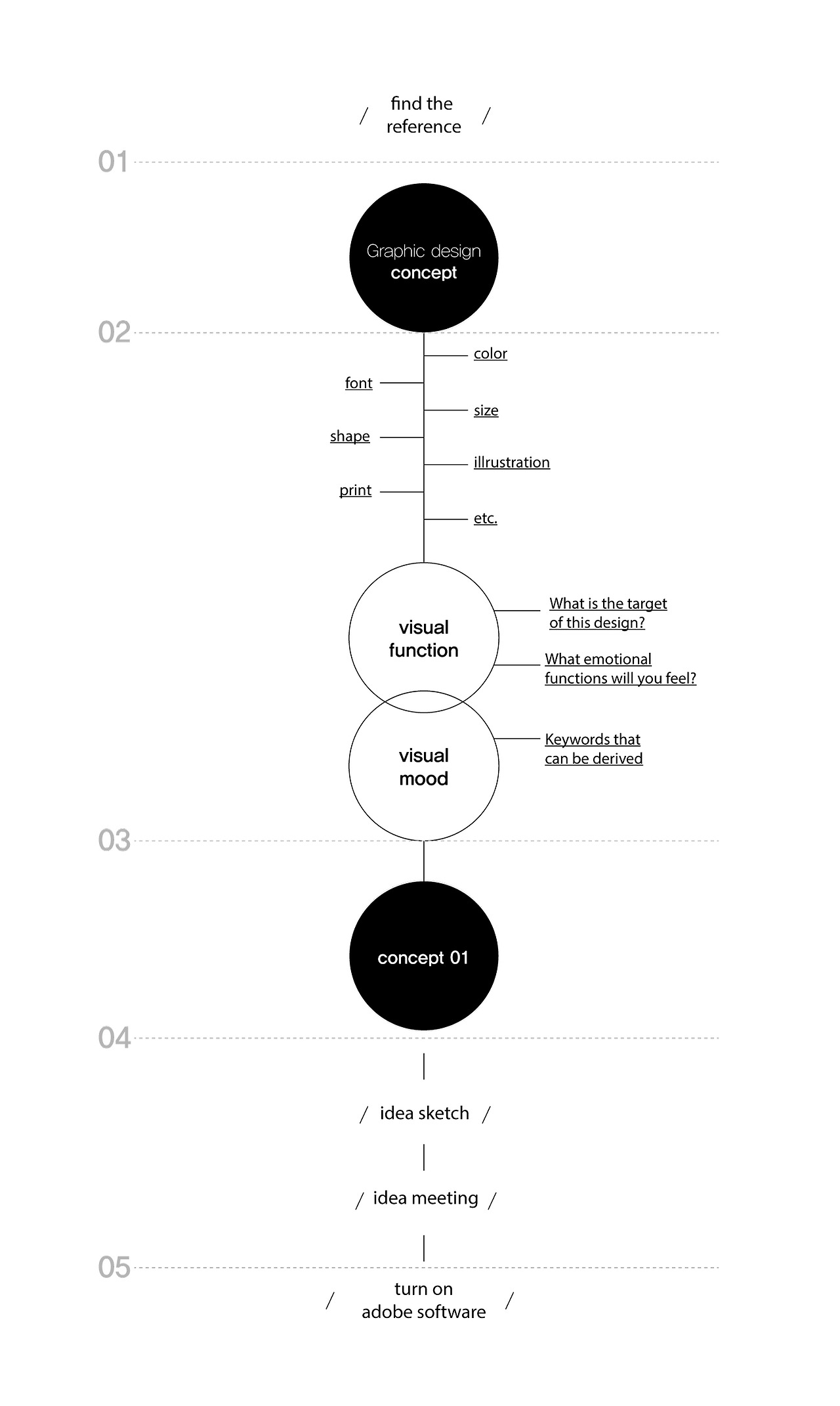 목적지에 가장 빠르게 도달하기 위해서는 지도가 필요하고 디자인에서는 그 역할을 하는 것을 컨셉이라고 할 수 있다. 이를 명확하게 설정한 뒤 디자인을 해야 하는데 많은 디자인 회사들은 컨셉이란 것을 알고 있고 또 중요하게 생각하지만 컨셉을 이루는 과정에서 클라이언트와 합의가 된 상태로 일을 하지는 않는다. 컨셉의 결과를 말 몇 마디로 주고받음이 아닌, 이루는 과정 하나하나를 클라이언트와 협의를 한 뒤 작업이 이루어져야 한다.*그 컨셉을 이루는 디테일한 과정은 아래 그림에 나와있다.