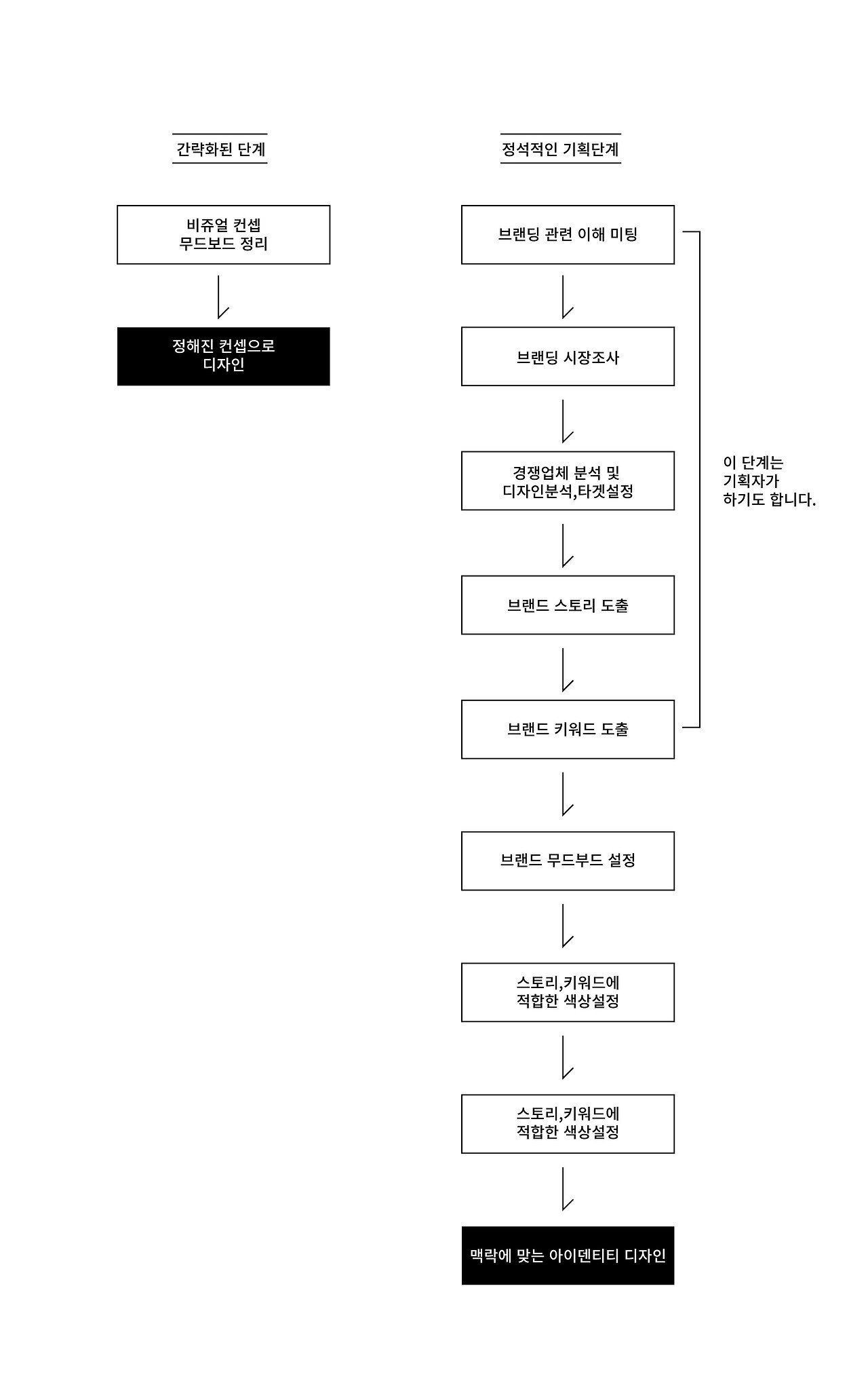 보통 이 두 가지는, 단가가 낮냐 높냐에 대한 기준으로 디자인적 기획의 비중을 설정하곤 한다. 단가가 낮고 빠르게 쳐내야 하는 경우에는 1번의 경우로, 단가가 높고 전문적으로 보여야 할 때는 2번의 경우로 일을 진행한다. 이 두 프로세스의 차이가 무엇인지 로고 디자인을 예시로 아래에 정리해보았다.