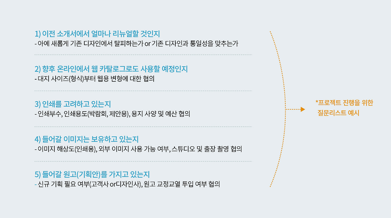 프로젝트와 관련된 질문들이 보통 PM, 디렉터 단에서 이뤄진다면 디자인과 관련된 질문은 실무자가 직접 참여하여 적극적으로 임할수록 좋은 결과가 나올 수 있습니다. 그냥 고객사에서 해달라는 대로 위에서 해달라는 대로 컨셉서를 제공받아 작업해도 '크게' 상관은 없지만. 본인이 하는 디자인에 있어서 스스로 질문을 하고 컨셉을 논의하는 것 자체로 이미 좋은 디자이너가 아닐까 싶어요. 주니어&시니어 단계에 이러한 습관을 가진다면 향후 디렉터로서 혹은 디자인팀장으로서 좋은 기회가 찾아오지 않을까요. 아무튼 본론으로 돌아가서 위와 같이 기업소개서를 리뉴얼한다고 가정하여 디자인 질의서를 정리해보면 아래와 같습니다.