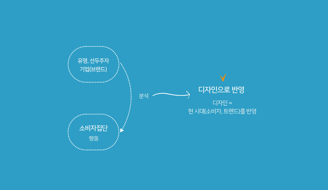 이미 유명한 기업들, 선도주자에 있는 브랜드들은 트렌드에 대해 공부하고 연구하여 그 결과를 디자인에 반영합니다. 그 기업들은 명확한 소비자의 행동 분석을 통해 여러 유형을 분석해내고, 정확한 데이터로 소비자와의 모든 접점에서 기업의 메시지가 잘 전달될 수 있도록 *통합 마케팅 커뮤니케이션(IMC)을 하고 있습니다. (통합 마케팅 커뮤니케이션은 단순한 명함 한 장이 아니라 브랜딩, 웹사이트, 홍보물, 회사소개서, 카드 뉴스, 기타 마케팅적 모든 요소 등이 포함) 즉 우리가 평소에 길에서 접하는 모든 광고물부터 시작해서, 어플리케이션, 홈페이지 등은 현시대의 트렌드를 반영한 결과물이라고 말할 수 있죠.
