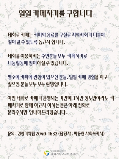 다른 복지관에서 기부하는 것은 해보았지만 이렇게 같이 함께 하면서 참여하는 경험이 없었던 것 같아요. 그런데 태화에서는 이렇게 함께 할 수 있었다는 점이 너무 좋았어요. 물질적으로 주는 것들은 어찌 보면 쉽게 할 수 있는데 이렇게 카페를 통해서 다른 사람들과 함께 봉사할 수 기회는 흔치 않거든요.