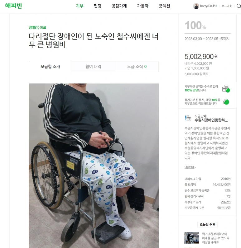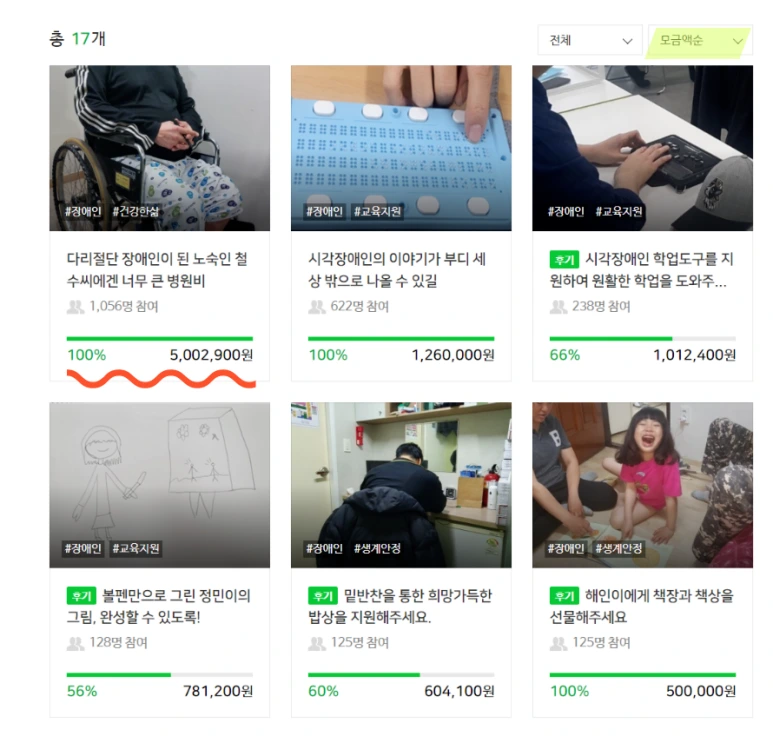 이렇게 모금글을 올린 결과, 네이버 해피빈 장애인 카테고리에서 메인 페이지에 올라가게 되었고 많은 사람들의 관심과 후원을 받을 수 있었다.
