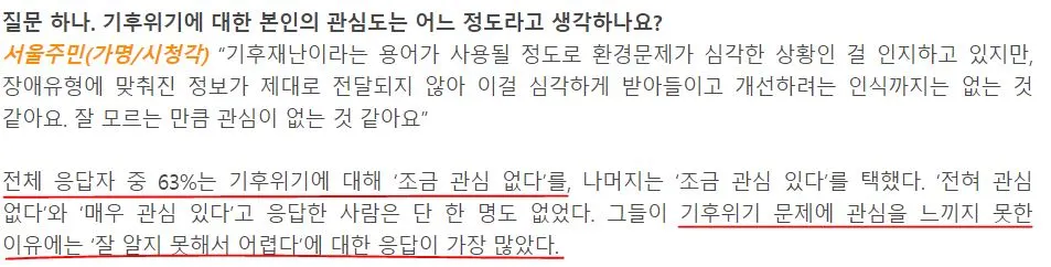 2022년 사단법인 장애우권익문제연구소에서 진행한 조사에 따르면’ 기후위기에 대한 본인의 관심도는 어느 정도라고 생각하는지 ‘에 대해 전체 응답자 중에서 과반수가 넘는 63%가 기후위기에 대해 ’조금 관심 없다 ‘라고 응답하였으며, 기후위기 문제에 관심을 느끼지 못한 이유에는 ’잘 알지 못해서 어렵다 ‘고 대답한 응답이 가장 많았다.’