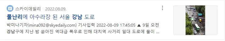 “물난리에 아수라장 된 서울 강남 도로” (스카이데일리 2022.08.09.)