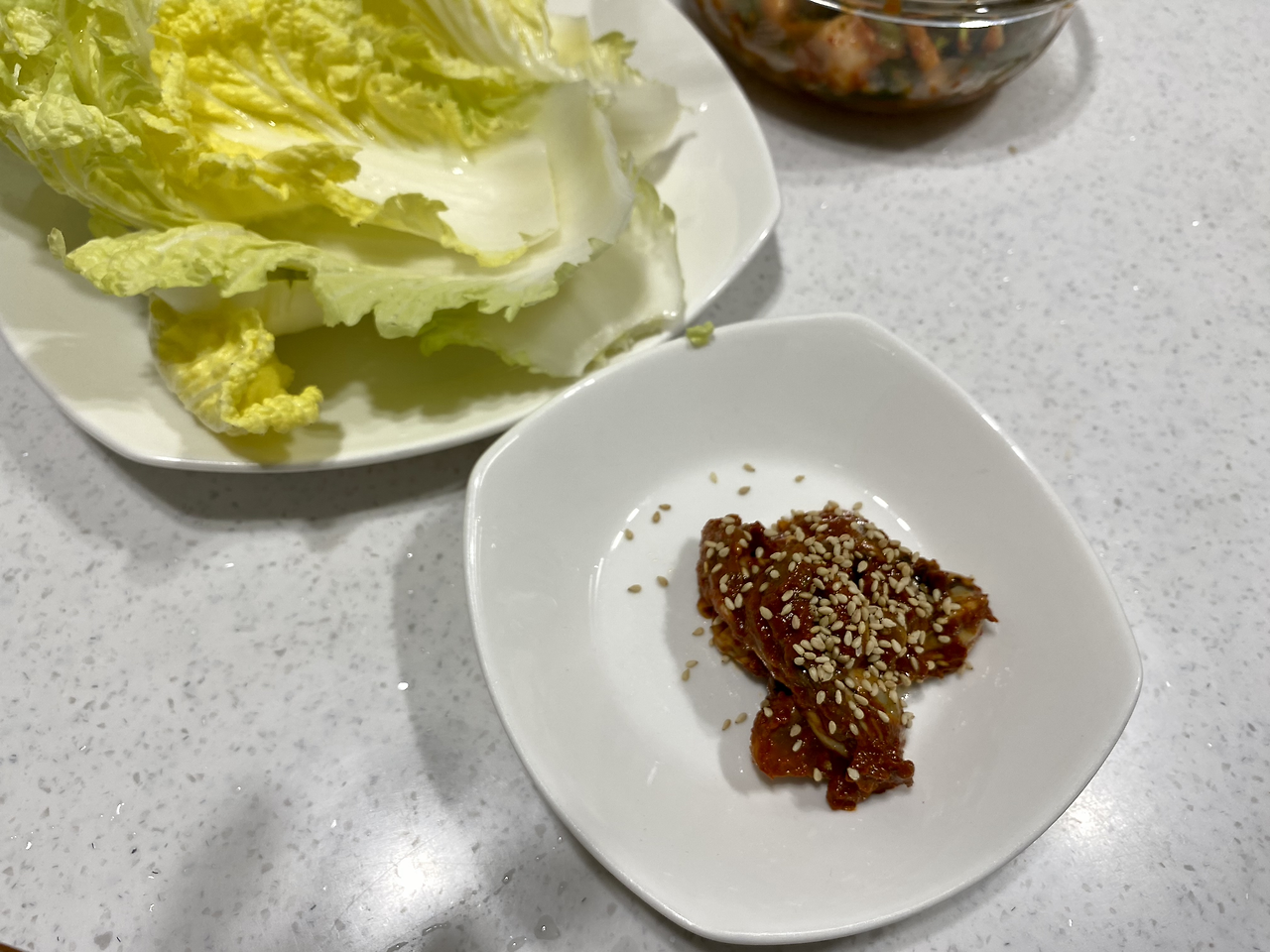 난 생굴보다 익힌 굴을 좋아하지만 어제는 잘 익은 배추에 싸서 몇개 먹었다. 옆에서 지켜보던 유라가 본인이 싸주고 싶다며 엄마 아빠 입에 차례로 넣어준다. 더 맛있다.