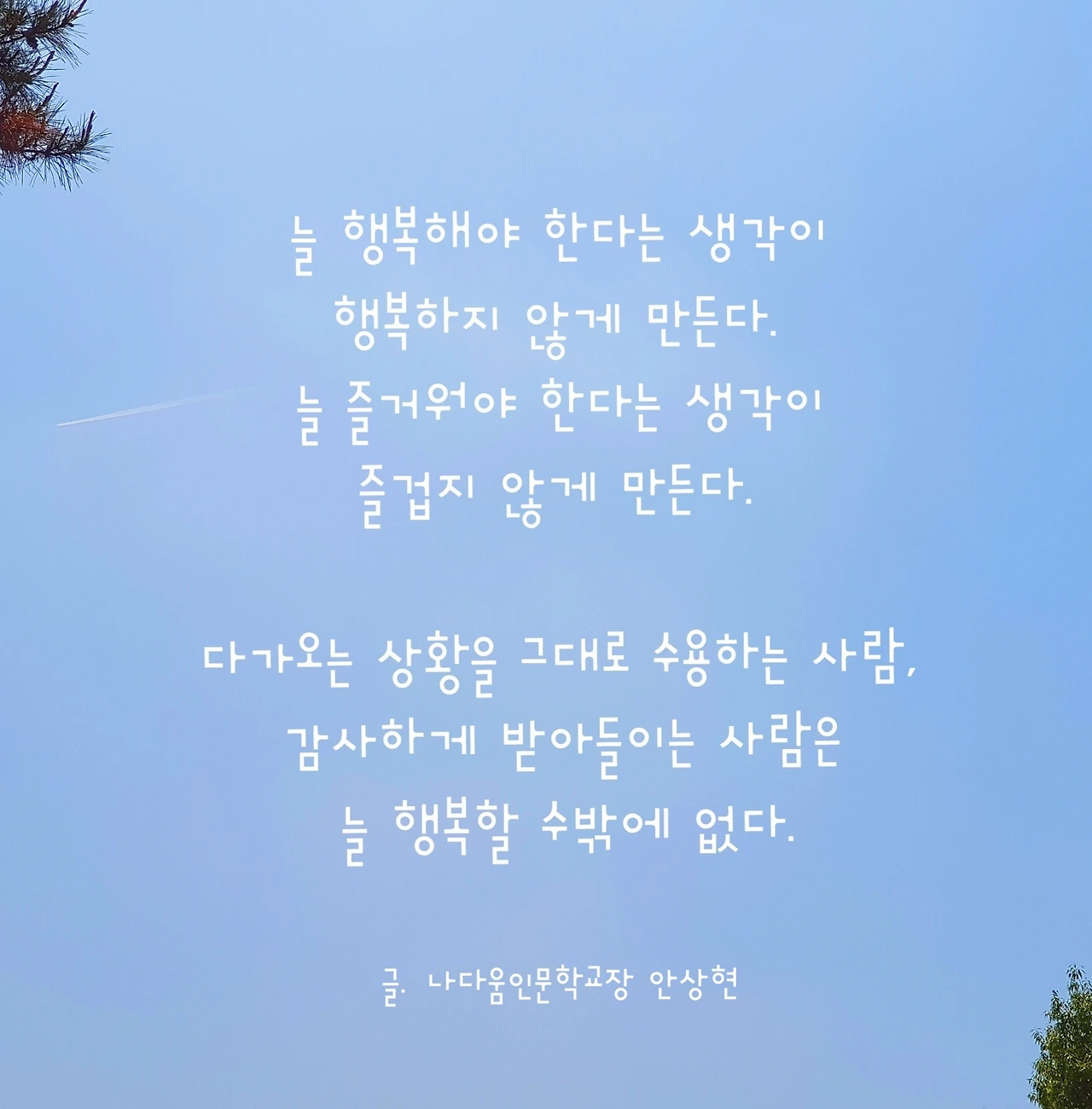 나다움레터(140)늘 행복해야 한다는 생각이 행복하지 않게 만듭니다. 늘 즐거워야 한다는 생각이 즐겁지 않게 만들기도 합니다. 다가오는 상황을 그대로 수용하는 사람, 게다가 감사하게 받아들이는 사람은 늘 행복할 수밖에 없습니다.오늘도 나답게 오예!