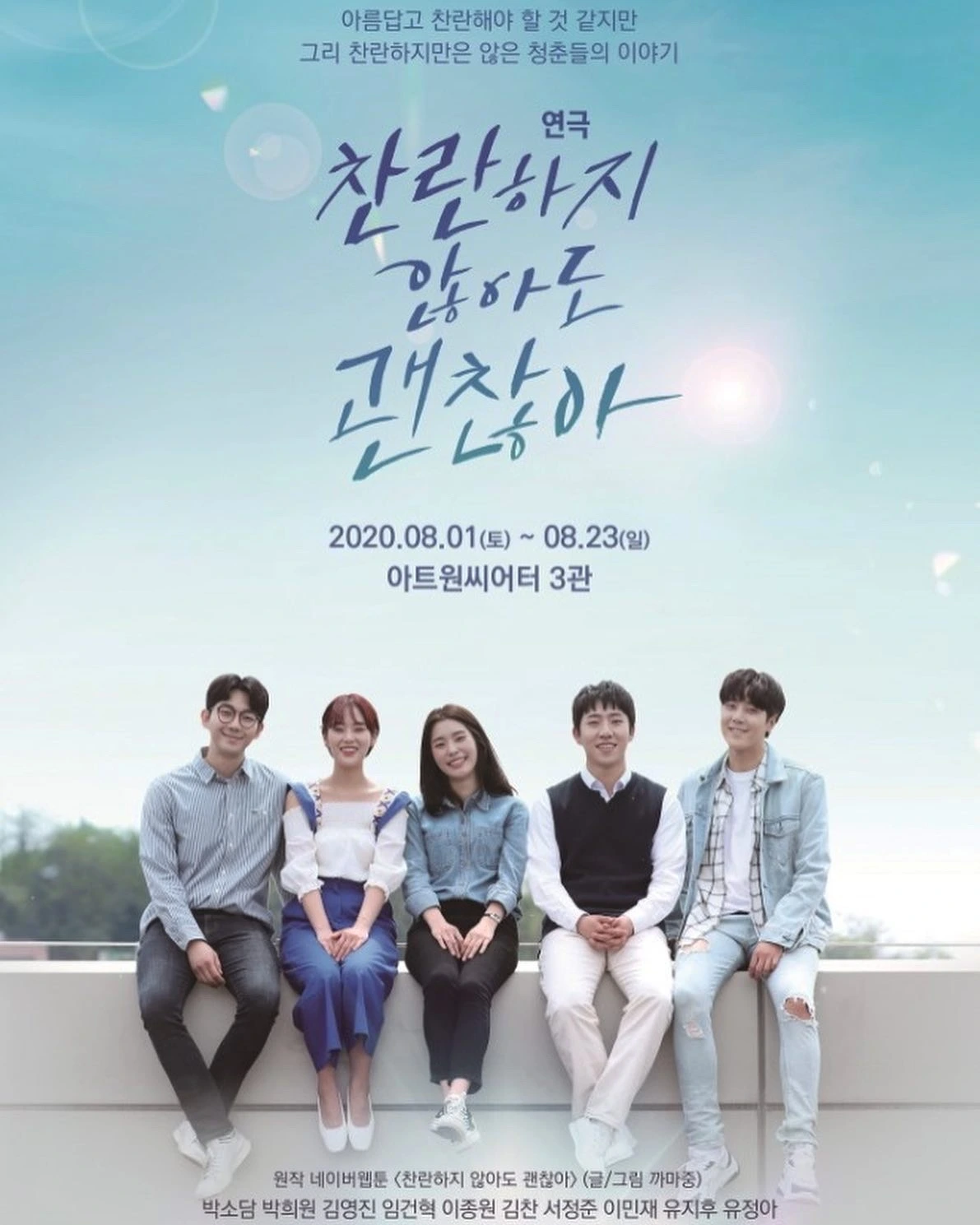 연극 <찬란하지 않아도 괜찮아>를 관람했다. 이찬란 역의 박소담 배우님, 윤도래 역의 김영진 배우님, 권유 역의 김찬 배우님, 최시온 역의 이민재 배우님, 김혁진 역의 유정아 배우님의 캐스트였다. 2017년에 나온 까마중 작가님의 웹툰이 원작으로 20대 초반의 교내 동아리 내에서 일어나는 일상과 우정 혹은 청춘의 이야기를 다룬다.