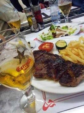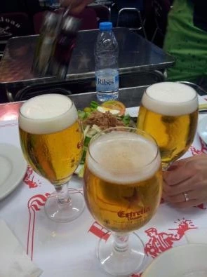 타파스를 먹는 bar뿐 아니라 테이블까지 손님으로 가득 찼던 그곳은 현지인들이 좋아하는 맛집이 분명했다. 줄을 서서 기다리는 동안 다른 테이블의 메뉴를 빠르게 스캔했다. 뭔가 정체 불명의 면 요리를 사람들이 많이 먹고 있었는데 안타깝게도 이름을 몰라 주문을 할 수 없었다. (이것은 훗날 마트에서 3분 조리 식품으로 다시 찾게 되었다.) 자리에 앉자마자 우선 에스트렐라 생맥주를 세 잔 시키고, 열심히 별 모양을 중심으로 인증샷을 찍었다. 그리고는 차례로 나온 음식 시식 -