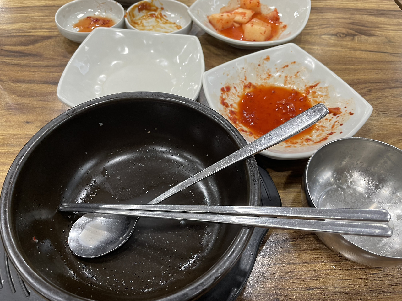 지난 번 헌혈하고 받은 상품권을 쓰기 위해 순대국집에 갔다. 사실은 고기가 땡겨서 혼밥하러 갔다. 고기가 땡길 때가 있는데 그럴 땐 정말 몸이 격렬?하게 단백질을 원해서라고 생각한다. 그래서 뼈해장국을 먹고 싶었으나 지류 상품권을 받지 않아 순대국집으로 최종 결정했다. 순대국을 좋아해서 동네 순대국집은 거의 다 먹어봤는데 예전에는 맛집이었다가 다시 방문했을 때 뭔가 달라진 집은 더 이상 잘 안 가게 된다. 영화 ’봄날은 간다‘에선 사랑도, 사람도 변하는데 순대국집도 물가 상승에 따라 (소비자 입장에선 안 좋은 쪽으로) 변할 수 있는 것이다. 오랜만에 최애 순대국집은 어떨지 궁금했다. 처음 방문했을 때(2019년)도 8,000원으로 다른 순대국집에 비해 가격대가 좀 있는 편이었는데 그 동안의 물가 상승으로 11,000원이 되어 있었다. 그럼에도 부동의 맛집엔 손님이 바글바글. 조금만 늦었으면 웨이팅에 걸릴 뻔 했다. 순대국 하나 주세요- 요즘은 식성에 따라 순대만/고기만 을 선택해 주문할 수 있다. 게다 노년층이 많은 순대국집은 비계와 껍데기, 머릿고기 등 살코기 외 부산물이 많다면 이 집은 살코기가 80% 이상이다. 껍데기와 오소리감투를 좋아하는 나는 조금 아쉽긴 하지만 그래도 비계가 많은 순대국보다는 훨씬 더 편하게 먹을 수 있어 좋긴 하다. 밑반찬이 깔린다. 양파, 쌈장, 깍두기, 겉절이 김치. 공기밥의 양이 적어 더 달라고 했더니 부족하면 더 준단다. 자기네 집 고기양이 많아서 공기밥을 남길까봐 적게 주는 것이니 일단 먹어보고 부족하면 이야기하란다. 단골은 아니지만 방문 경력자로서(5번째 방문) 분명히 더 달라고 할 것 같았지만 서빙하는 아주머니의 강력한 눈빛에 일단 한 발 물러났다. 뽀얀국물은 아주 담백하고 고소했다. 숟가락에 가득 담아 한 입에 쏙. 앗 뜨거! 가게 안의 많은 사람들이 내가 숟가락을 입에 넣었다가 도로 꺼냈다는 걸 알아채진 않았겠지? 추접스러움을 감당하지 말고 호호 불어 먹기로 했다. 오랜만에 먹으니 아주 맛있다. 이 집은 겉절이 김치도 맛있어서 밥이 아주 술술 넘어간다. 한 공기를 클리어하고 당연하게도 밥을 ‘조금만’ 더 달라고 요청했다. 그렇게 두 공기까지 클리어하니 옆 자리 손님들이 가고 없었다. 맛있게 먹어 빈 그릇을 사진으로 남겨본다. 혼밥을 하고 맛집 인증은 사진으로 한다. 먹기 전의 음식사진과 빈 그릇 사진. 그게 바로 진정한 맛집 블로거(물론 난 맛집 블로거는 아니지만)의 증신!! 내가 생각하는 맛집 철학은 빈 그릇에서 나온다고 생각하는데 예쁜 것만 찍고 보고 싶어하는 사람에게 빈 그릇은 확인하고 싶지 않은, 보여줄 수 없는 진실이 아닐까 한다. 진실을 가리고 싶을 수록 구구절절히 포장하고 온갖 미사여구를 갖다 붙이는 법. 하지만 그런 맛집 블로그가 먹히는(요즘은 먹는 것만큼 보여주는 것도 중요하니까!) 현실. 맛집 블로거도 아닌데 왜 이런 글을 쓰고 있는 거지? 순대국 잘 먹고 글은 삼천포로 빠져 버렸네. 여튼, 오늘도 잘 먹었습니다. 돼지님, 일용할 양식이 되어주셔서 감사합니다.