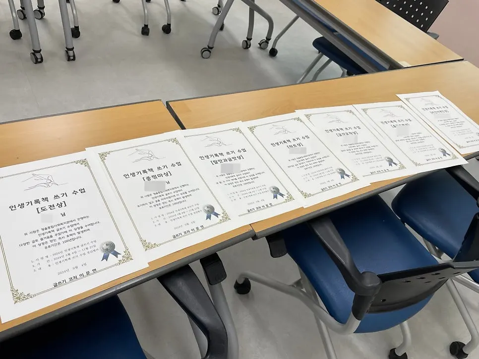 글쓰기 수업에서 중간평가를 했다. 중간평가가 무엇인고 하니, 글쓰기 수업이 어떤 의미인지 생각해보고 문항(마치 강의 평가처럼)을 작성하는 것이다. 그리고 글로도 써보는 과정. 글쓰기 수업을 통해 무엇을 느꼈느냐, 이 수업이 어떤 의미인지를 글을 통해 생각해보는 것이 바로 중간평가다. 그냥 글만 쓰고 지나가면 재미없어서 작년에는 상장을 준비했었다. 올 해도 드리는 게 좋을 것 같아 복지사님과 협의해 상장을 수여하기로 했다. 수업은 수업이면서 하나의 퍼포먼스이기도 하다. 수업의 커리큘럼을 정하고 그 커리큘럼대로 수업을 잘 진행하면서 수업 내용도 알차다면 GOOD. 하지만 프로그램은 때로 어떤 퍼포먼스를 요한다. 왜냐하면 수강생들의 글쓰기 실력은 눈에 안 보이지만 사진만큼은 눈에 잘 보이기 때문이다. 남는 건 사진 뿐. 그래서 사진으로 남길만한 행사를 기획하고 사진도 열심히 찍어준다. 꼭 그것때문에 상장을 준비하는 건 아니다. 난 수업을 통해 수강생들이 글쓰기 실력이 성장하고 그룹형 글쓰기를 통해 얻는 의미가 있기를 바란다. 하지만 장장 7개월동안 그것만으로 수업을 채우기란 재미없지 않은가. 어차피 해야 할 중간평가라면 조금 더 기억에 남았으면 하는 바람에 상장을 준비했다. 총 8명. 각자의 개성이 다르다. 한 명이 잘 쓰는 수업이 아닌, 각자의 다양한 글이 모여 좋은 수업을 만들어간다. 그래서 상장 이름도 제각각이다. <중꺾마상>, <위트상>, <솔직표현상>, <글감포착상> 등등 개인에게 맞는 이름을 붙였다. 상장 이름 생각해내느라 많이...힘들었다. 그래도 유튜브에서 찾은 웅장한 BGM도 틀고 자기 이름이 호명되었을 때 상장 받으러 나오는 수강생들이 조금은 즐겁지 않았을까.(물론 안 그렇게 생각했어도 눈치가 제로인 나는 알 길이 없다. 그냥 내 식대로 즐거웠을 거라 추측할 따름) 장장 7개월의 수업, 이제 반이 지났다. 남은 3개월도 알차게 가보자.