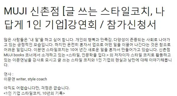 MUJI 신촌점 [글 쓰는 스타일코치, 나답게 1인 기업]강연회 / 참가신청서 많은 사람들은 "내 일"을 하고 싶어 합니다. 개인의 행복과 만족감, 다양성이 존중되는 사회로 나아가고 있는 긍정적인 모습입니다. 하지만 온전히... goo.gl