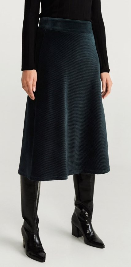 2) 실루엣 및 길이: 펄럭거리지 않고 자연스럽게 떨어지는 A라인이야. 그래서 캐주얼템이지만 얌전하게 입기 좋지. 격식있는 자리에 입고갈 만한 느낌이라는 거야. 미디 길이로 무릎을 살짝 덮기 때문에 무릎 위로 올라오는 스커트가 이제 어색한 30대, 40대가 캐주얼하게 입기에 아주 좋아. 코듀로이 소재라 아마 일반 구두보다는 앵클 부츠나 롱부츠에 입는 게 제일 예쁠 것 같아.
