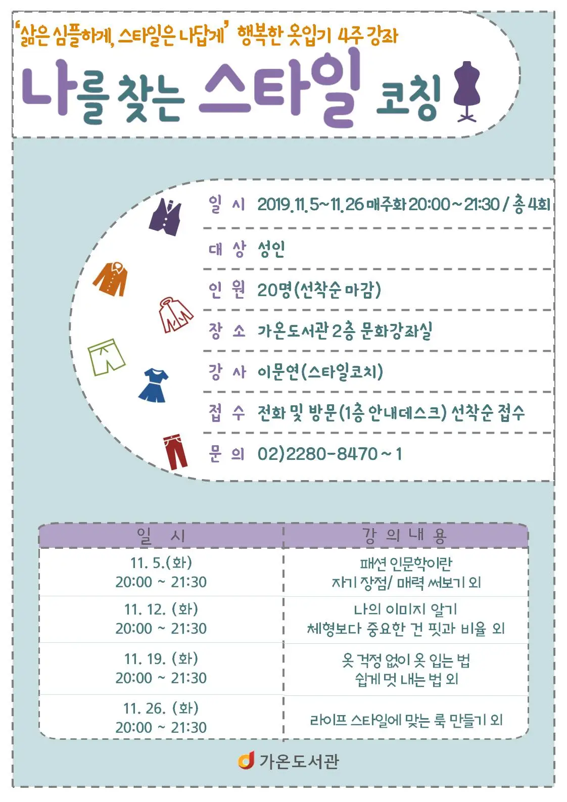 커리큘럼은 행복한 옷입기 연구소에서 진행하는행복한 옷입기 4주 강좌랑 거의 비슷합니다.신청 및 문의는 가온도서관으로 해주세욤! :)