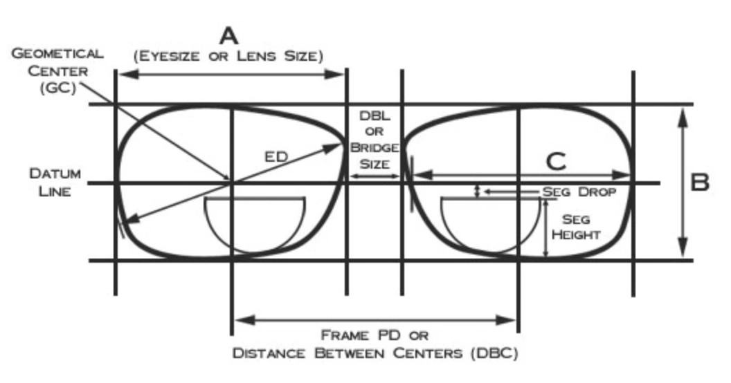 안경의 다리 안쪽에 보면 위와 같이 사이즈가 있다. 또는 '48□21 138'이라고 표기되어 있다. 가장 먼저 눈에 띄는 사각형 부호는 '박싱시스템 boxing system'으로 사이즈를 측정했다는 의미다. 이 시스템은 국제표준화기구(ISO)의 규약으로, 모든 렌즈 프레임을 사각형으로 지환해 측정하는 방법이다. 덕분에 다양한 프레임의 모양을 동일한 기준으로 계측할 수 있다. 위의 진저아이웨어의 선글라스는 다리의 길이가 138mm렌즈너비가 48mm이고, 브릿지너비(=렌즈 사이의 거리)가 21mm이다. 렌즈가 작을 수록 브릿지 너비가 넓어진다. 평균적인 사람의 눈 너비를 고려하여 디자인되기 때문에 두 수치는 보통 반비례한다.