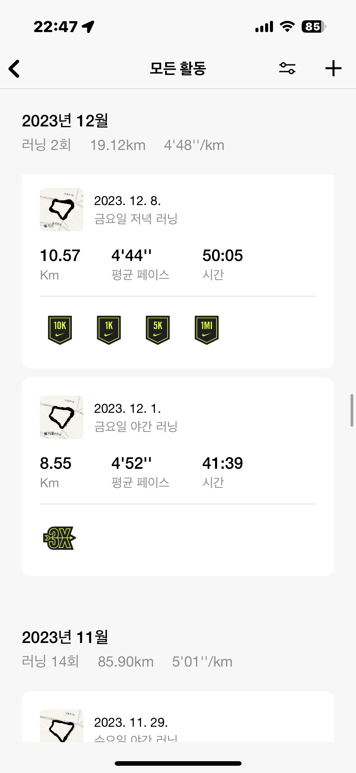 그러다 2022년 군대에서 내가 달리기 시작했다. 이때의 마음가짐은 단순했다. 몇 KM를 달리고, 얼마의 평균 페이스를 가지는지 따위는 신경 쓰지 않았다. 그저 건강한 삶과 루틴을 가져보기 위해, 그냥 30분만 달려보자가 나의 마음가짐이었다. 이때의 나는 안경을 쓰고 있었는데 땀과 함께 흘러가는 무거운 안경 때문에 많은 스트레스를 받았던 기억이 있다. 라식을 하고 난 뒤, 나는 얼마나 행복했는지 모르겠다. 하지만 사람은 참으로 어리석다. 그 사소한 행복을 잊은 채로 살아간다. 감사함을 잊은 채로 말이다.