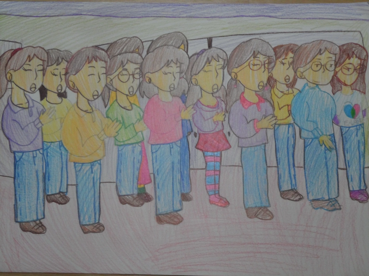졸업식 풍경을 이렇게 그렸다. 노래를 부르고 있는 모습이란다....