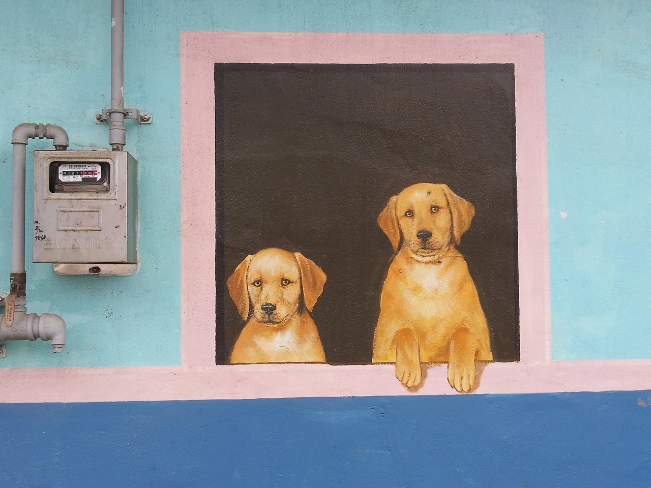 개를 무서워하는 아들에게 벽화 속의 사랑스러운 개를 보여주고,