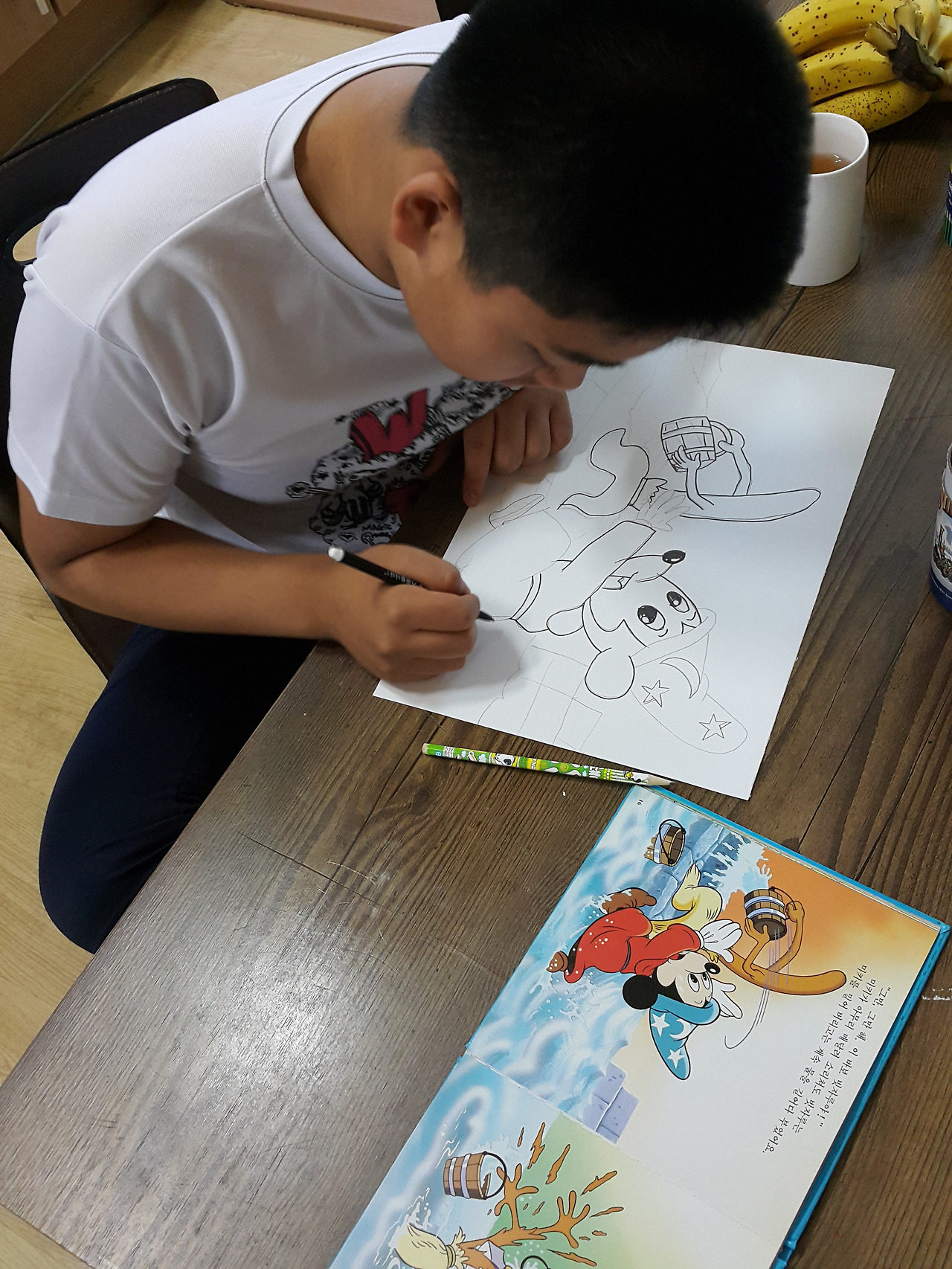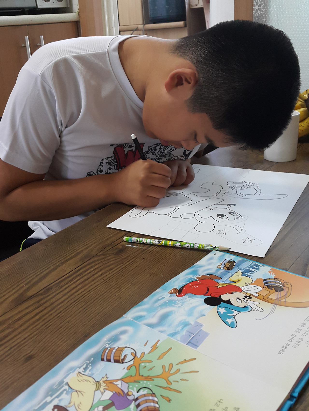 매일매일 책 한 권을 읽고 자신이 맘에 들어하는 장면을 그리는 작은 아들,