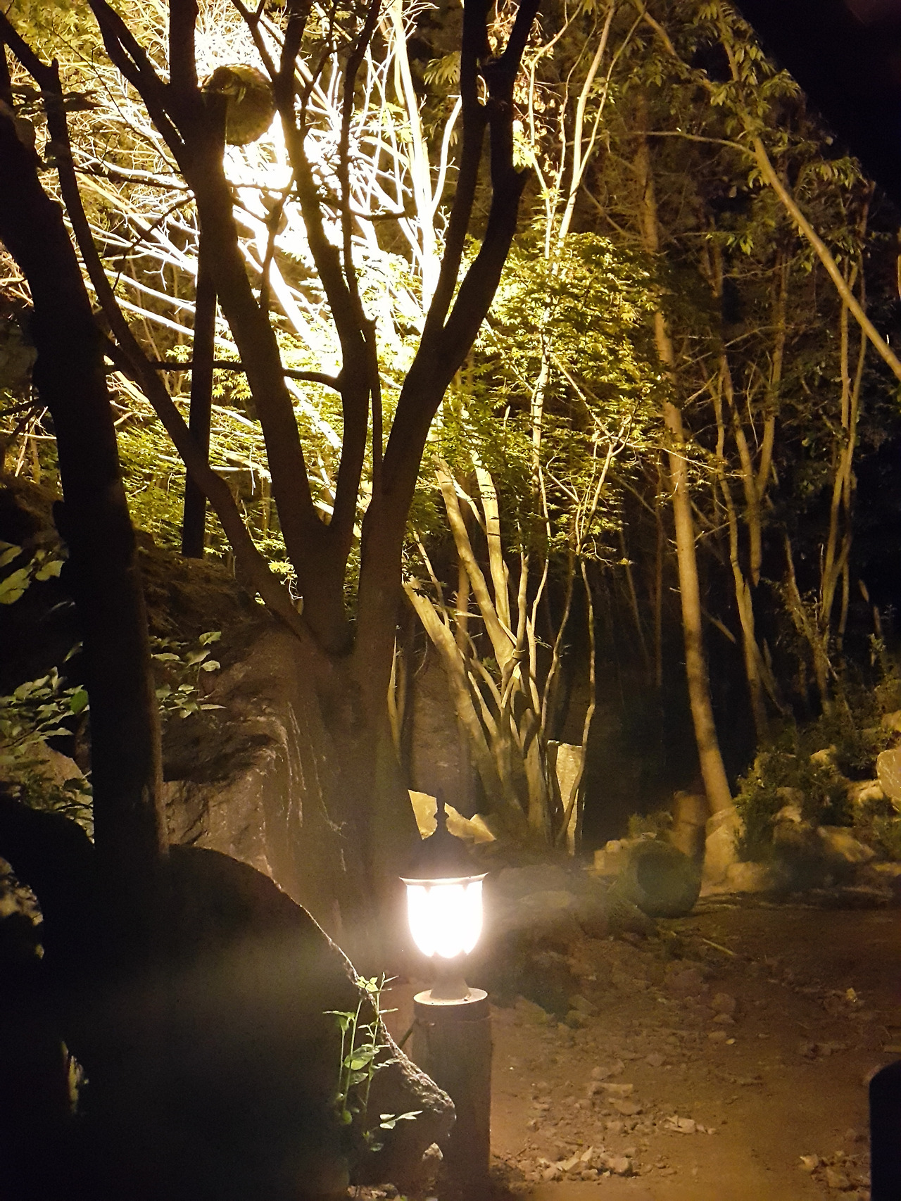 사람의 발길이 드문 곳의 가로등이 늘씬하게 뻗은 나뭇가지들의