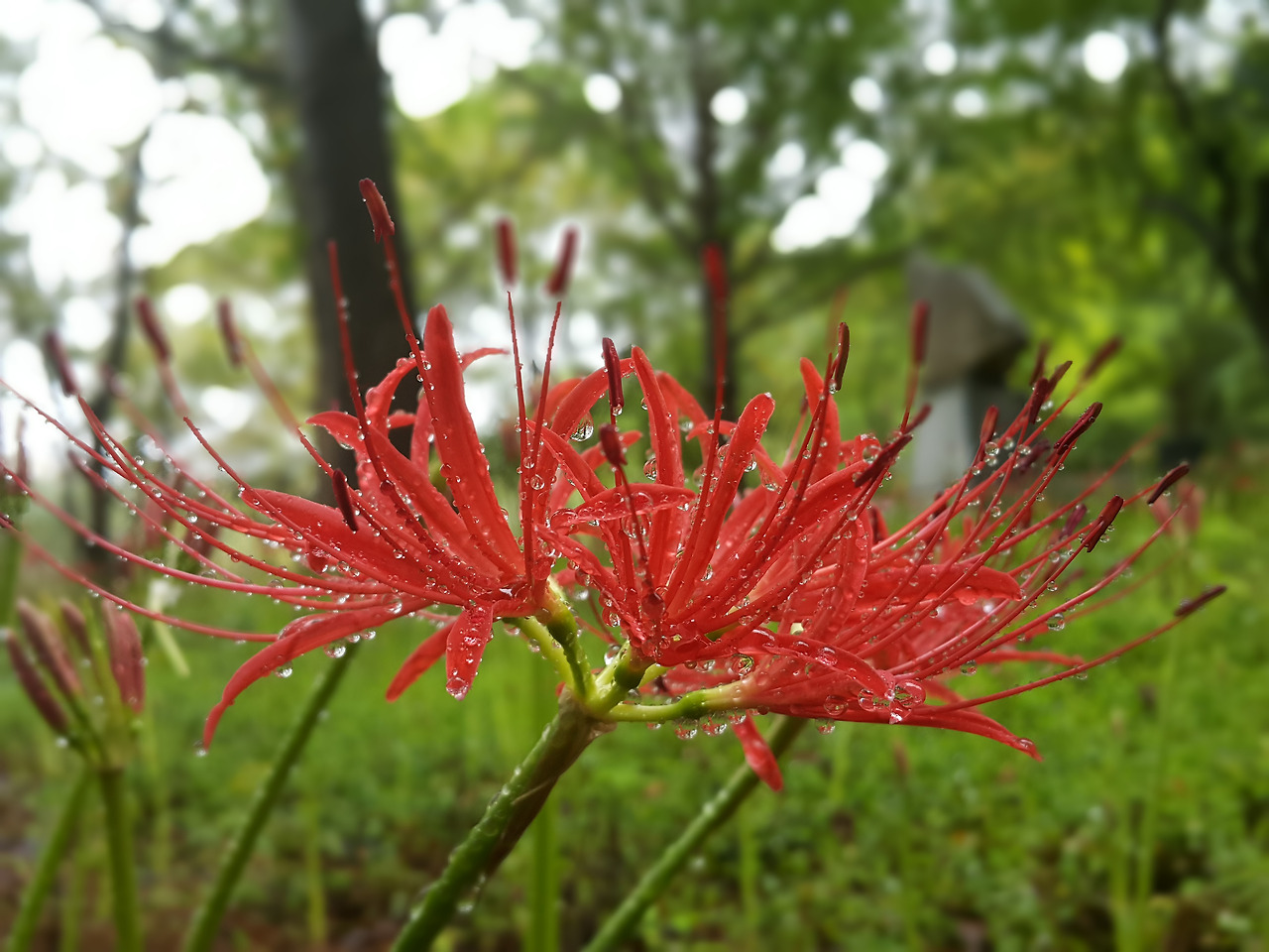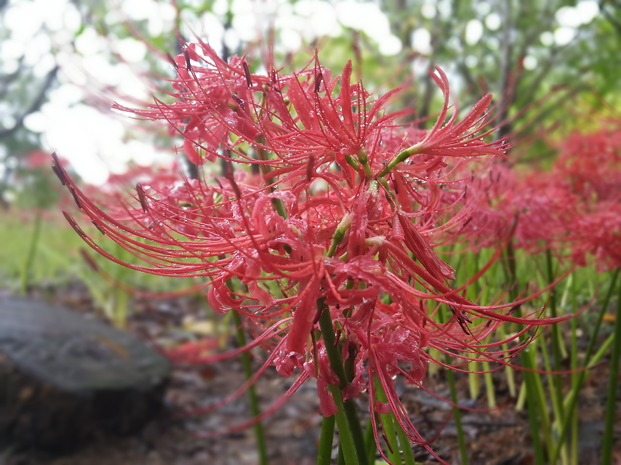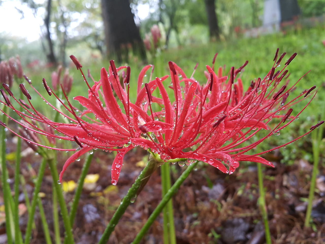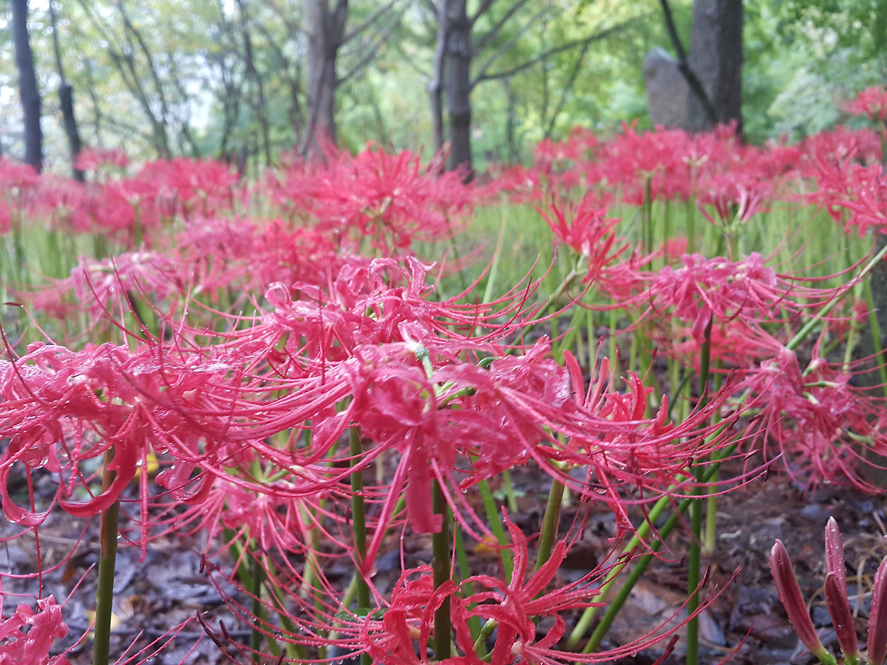 '석산은 꽃대의 높이가 30~50㎝ 정도로 자라며, 반그늘이나 양지 어디에서나 잘 자라고, 물기가 많은 곳에서도 잘 자라는 품종이다. 피처럼 붉은 빛깔의 꽃과 달걀 모양의 비늘줄기가 가진 독성 탓에 ‘죽음의 꽃’으로 여겨져 왔는데, 그래서인지 꽃말도 죽은 사람을 그리워하는 ‘슬픈 추억’이다.'
