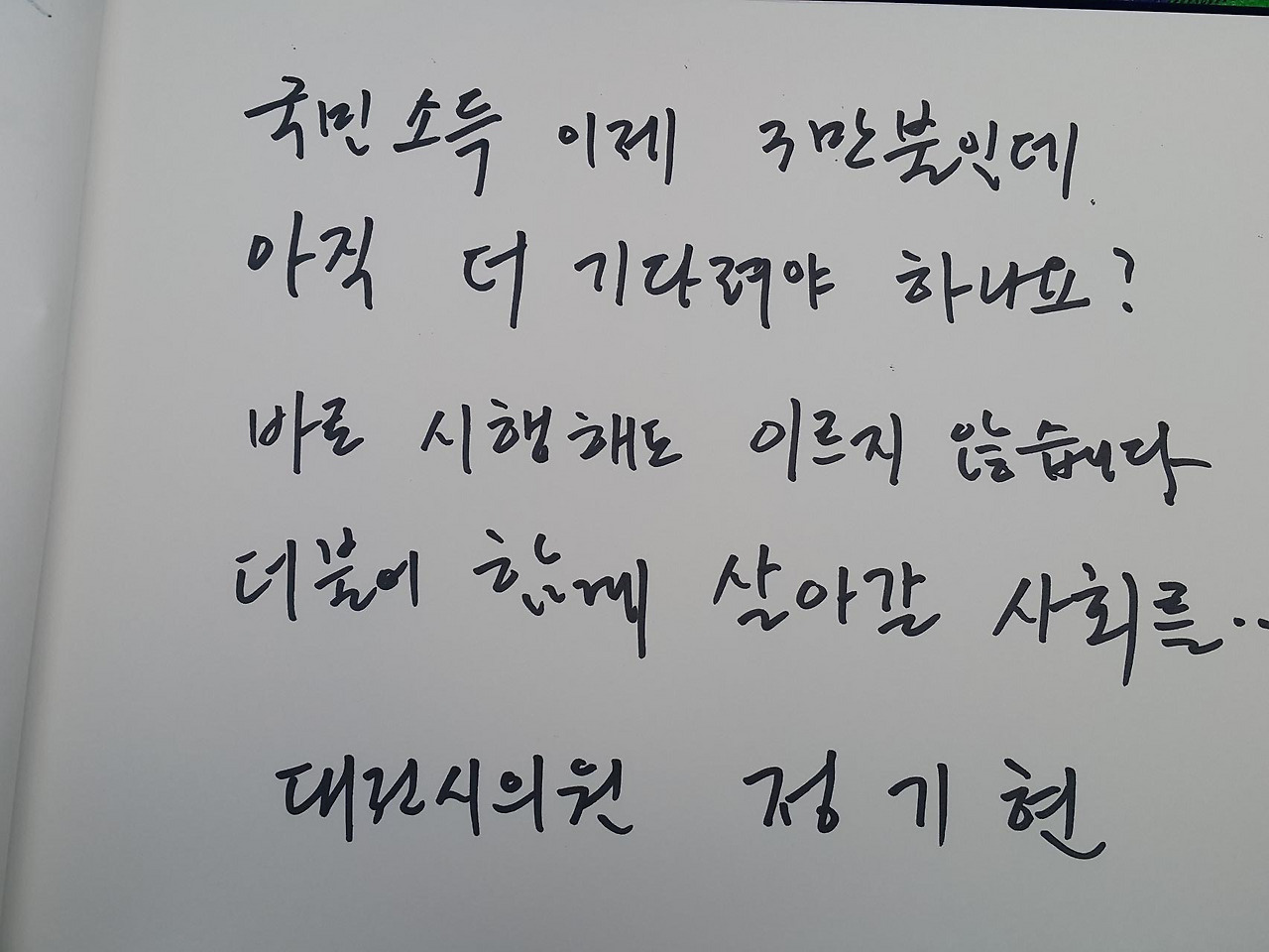농성장을 찾아주신 정기현 시의원님이 써주신 문구가 가슴에 사무친다.