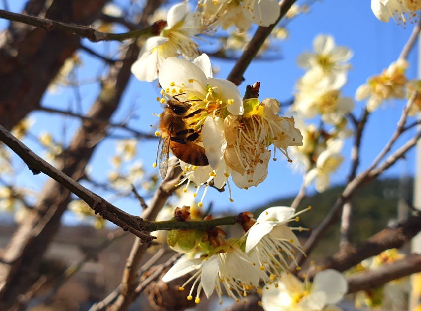 홍매의 꽃송이만큼이나 벌들이 찾은 것 같은...