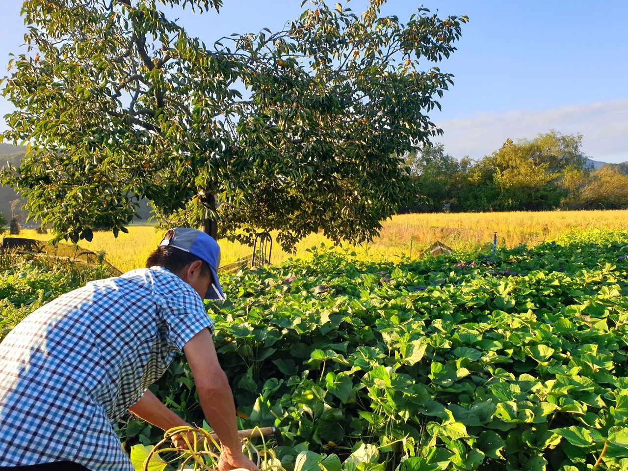 모처럼만에 낫으로 고구마 줄기를 걷어내고