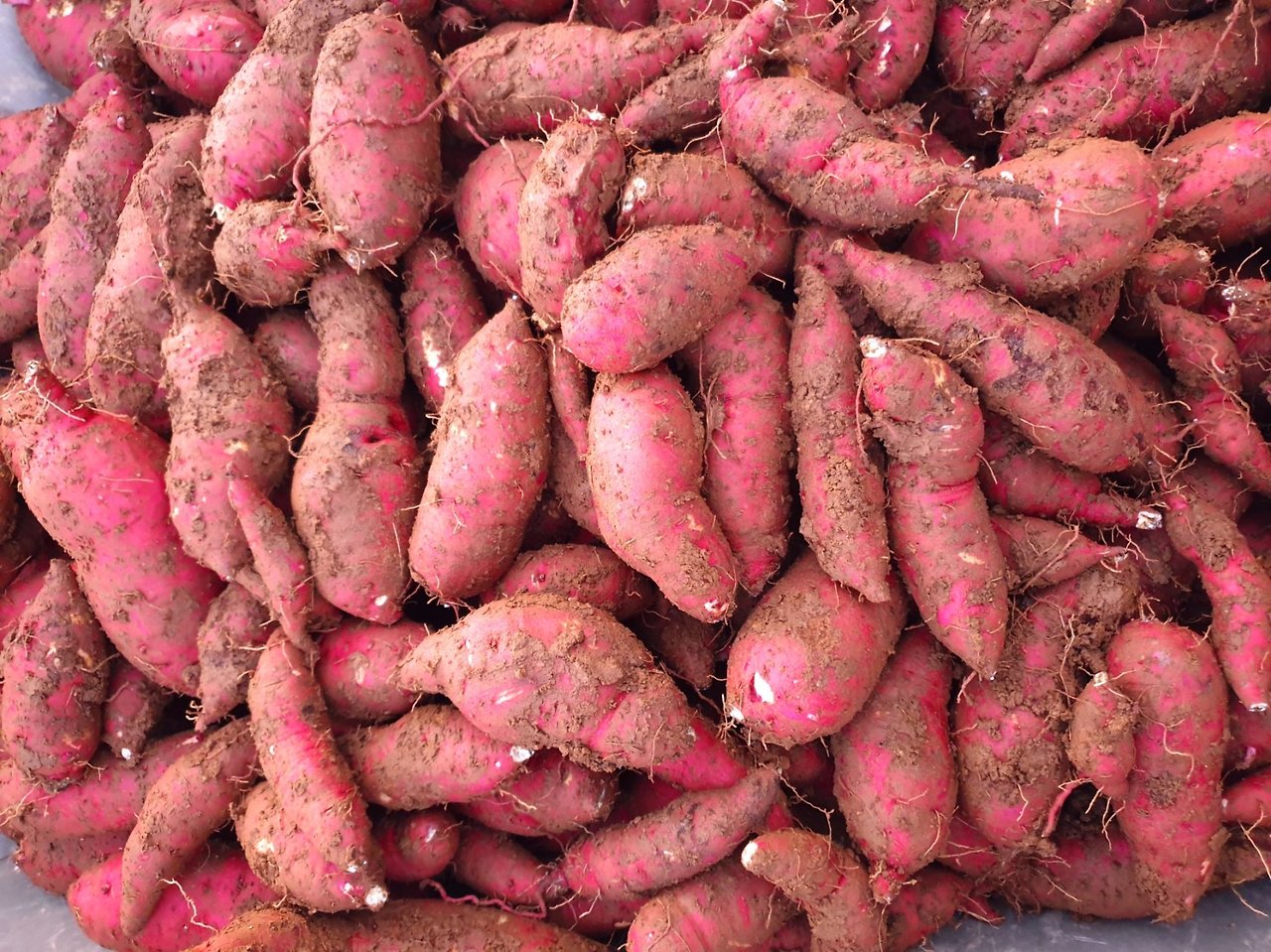 축축하게 젖은 땅속에서 빼꼼 보이는 붉은 고구마.