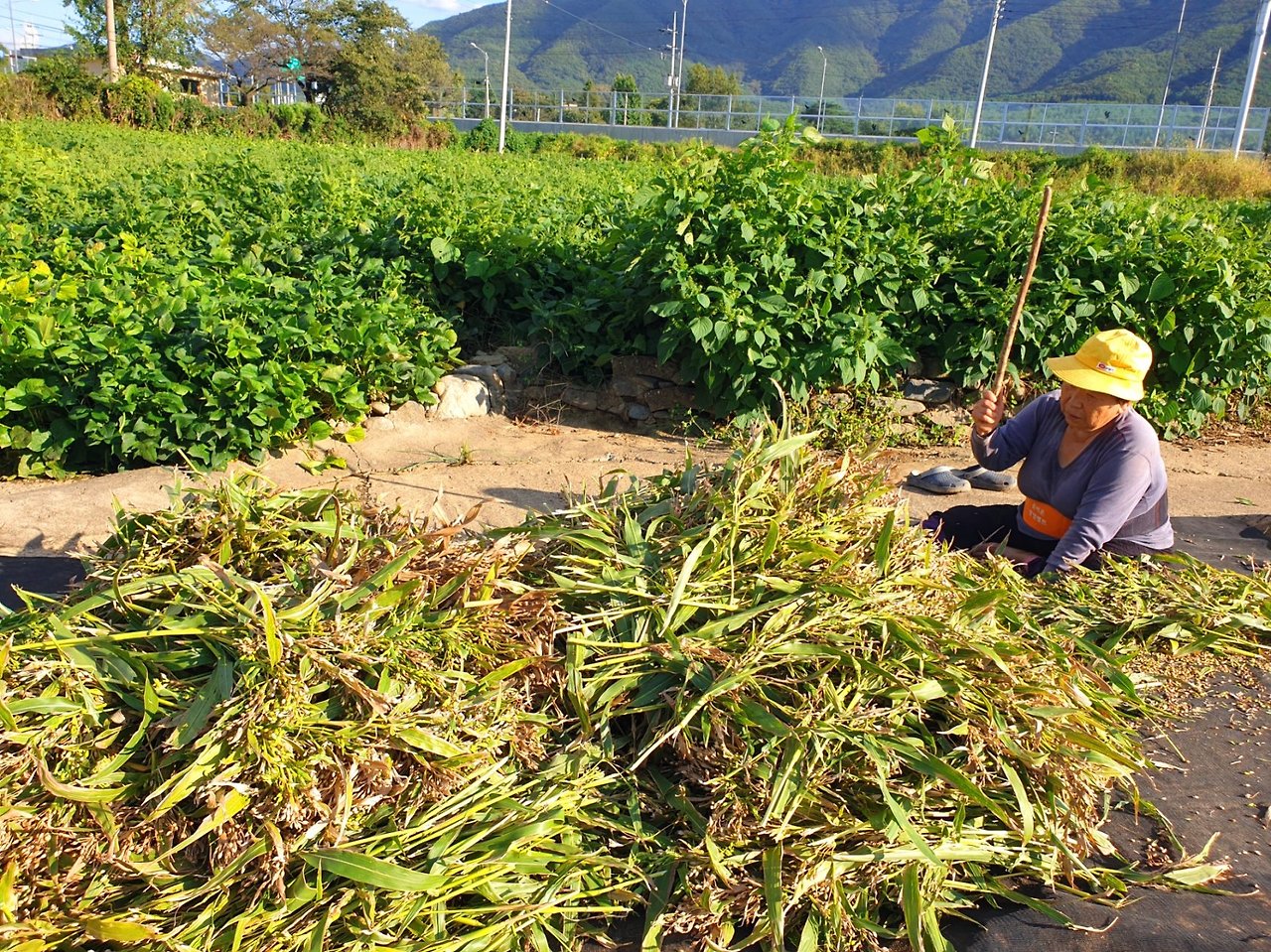 집 옆으로 난 밭에서는 부모님이 율무를 베시느라