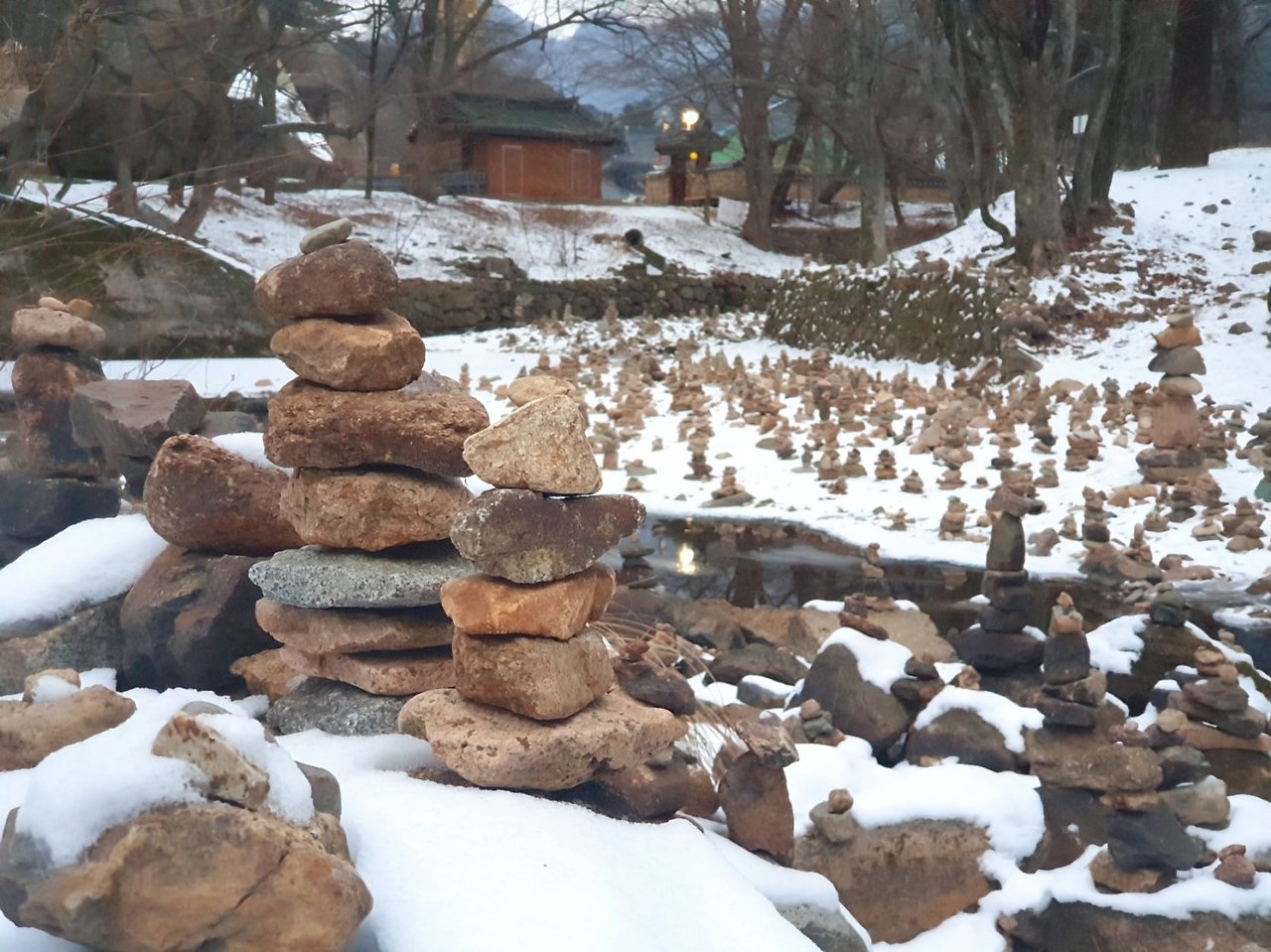 하천에 그득한 작은 소원 돌탑들도 폰에 담았지.