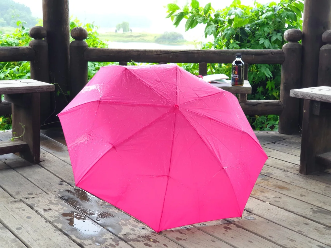 비가 정자 안까지 세차게 밀고 들어오는 바람에
