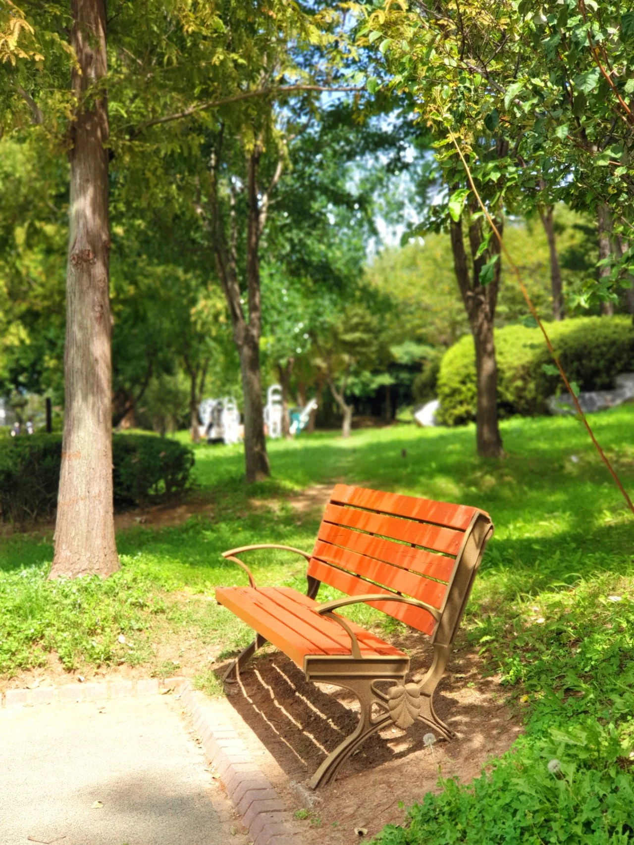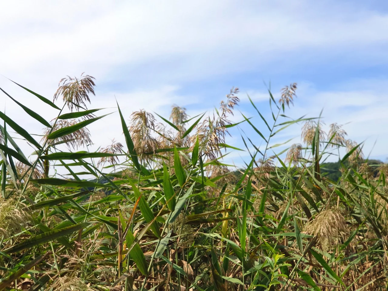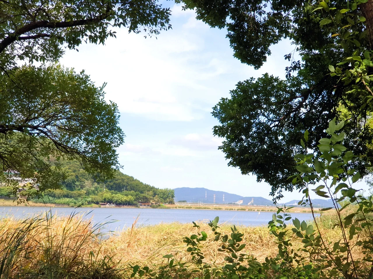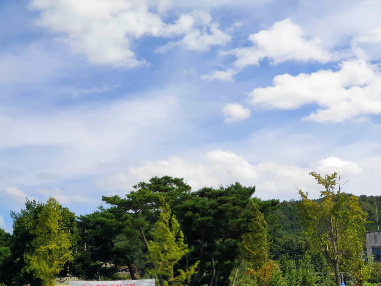 시야를 가득 채운 맑은 하늘과 가을로 향하는 초록이들,