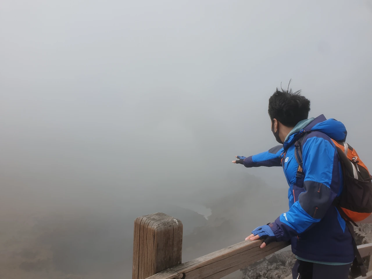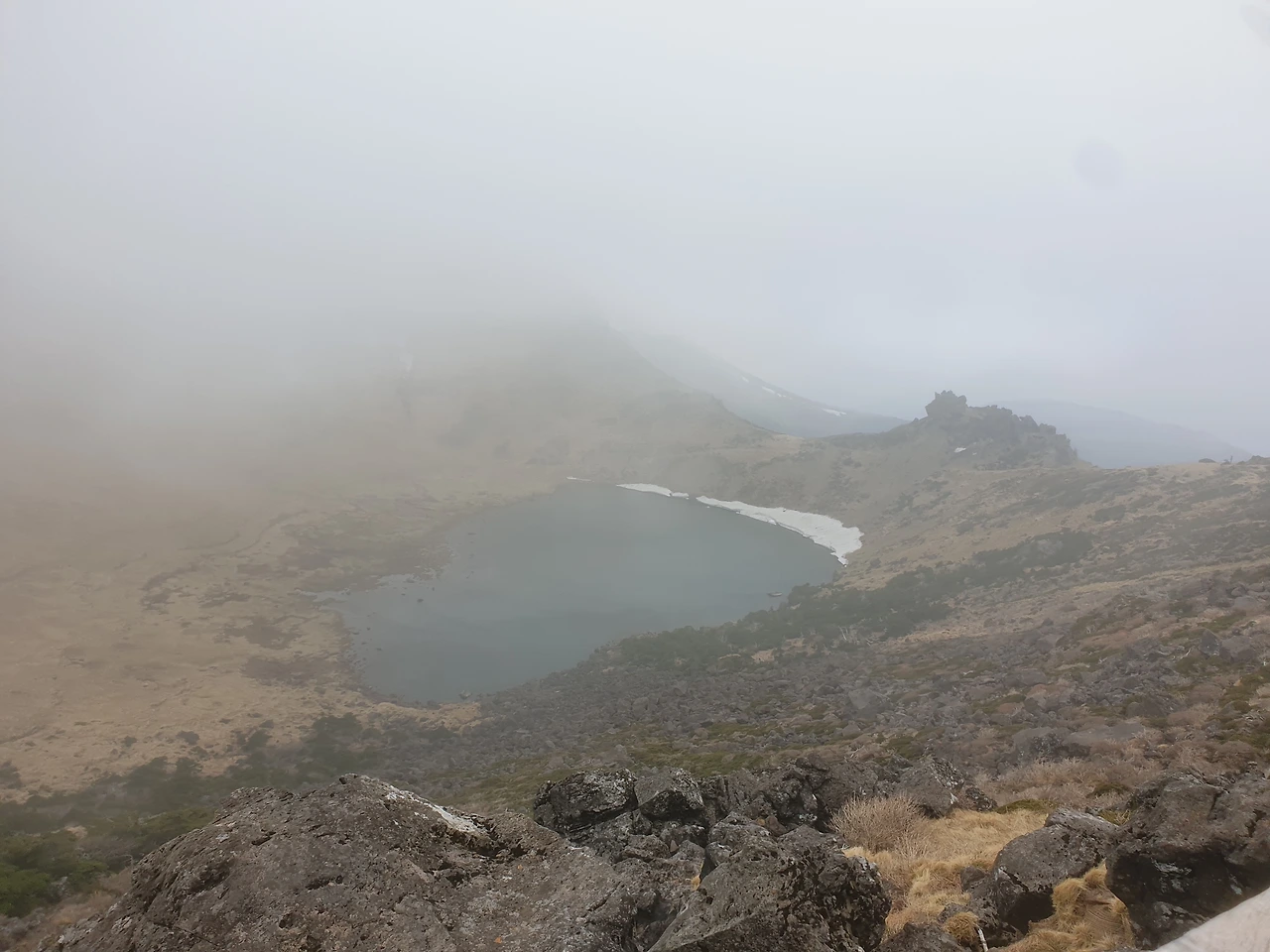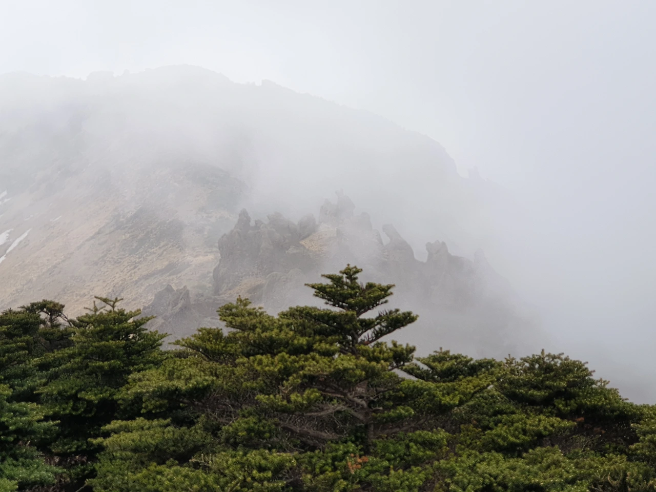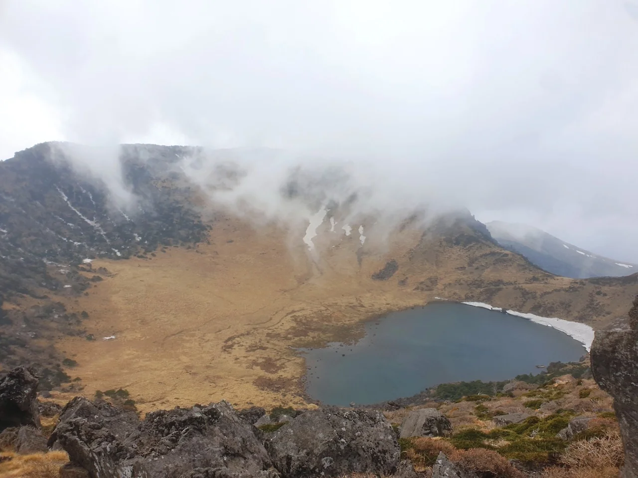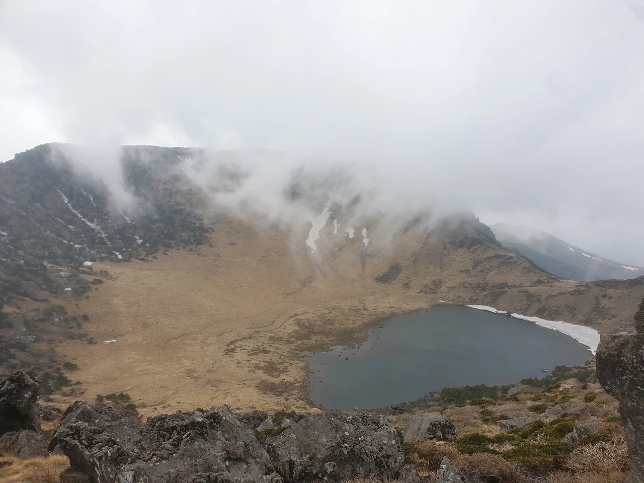 백록담이 안개에 가려 완전히 숨었다가 드러내기를