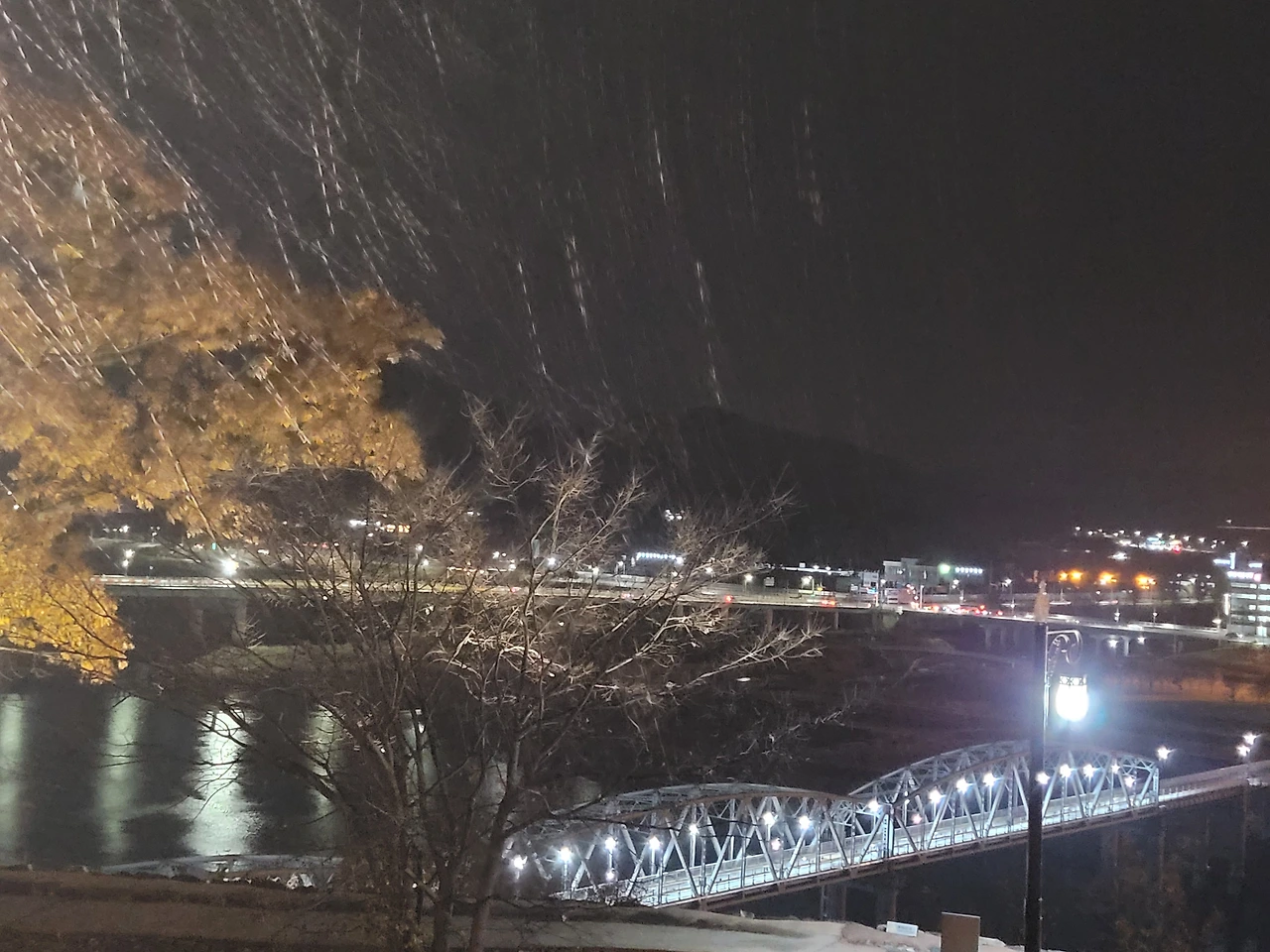 가로등으로 스치는 빗방울은 공격적으로 보이나