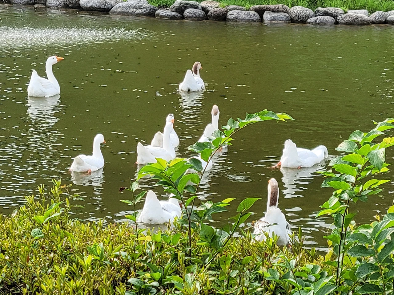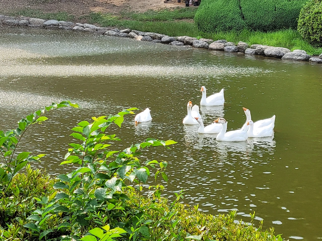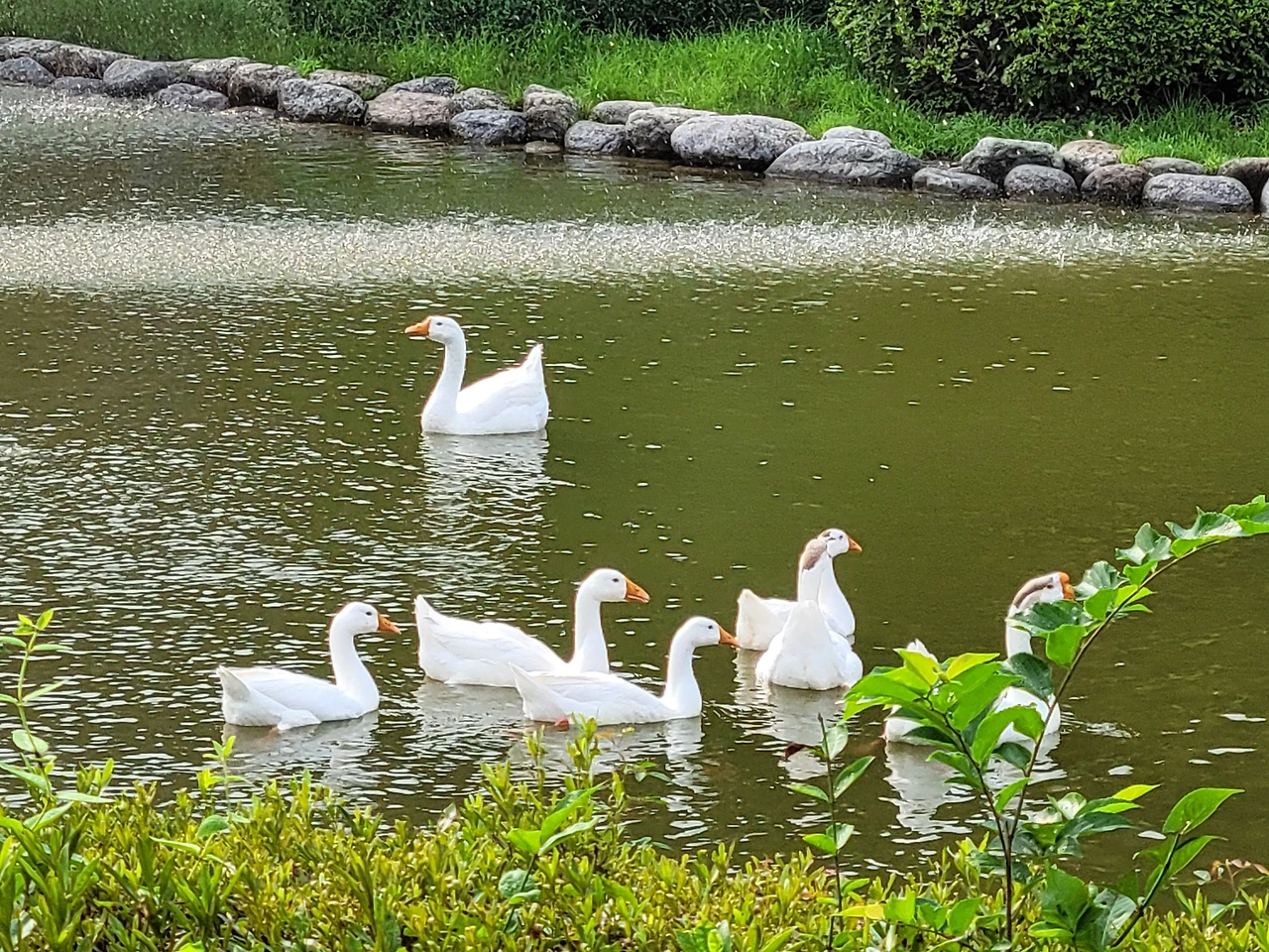 그 오리 가족들이 연못에서 여유를 즐기고 있었다.
