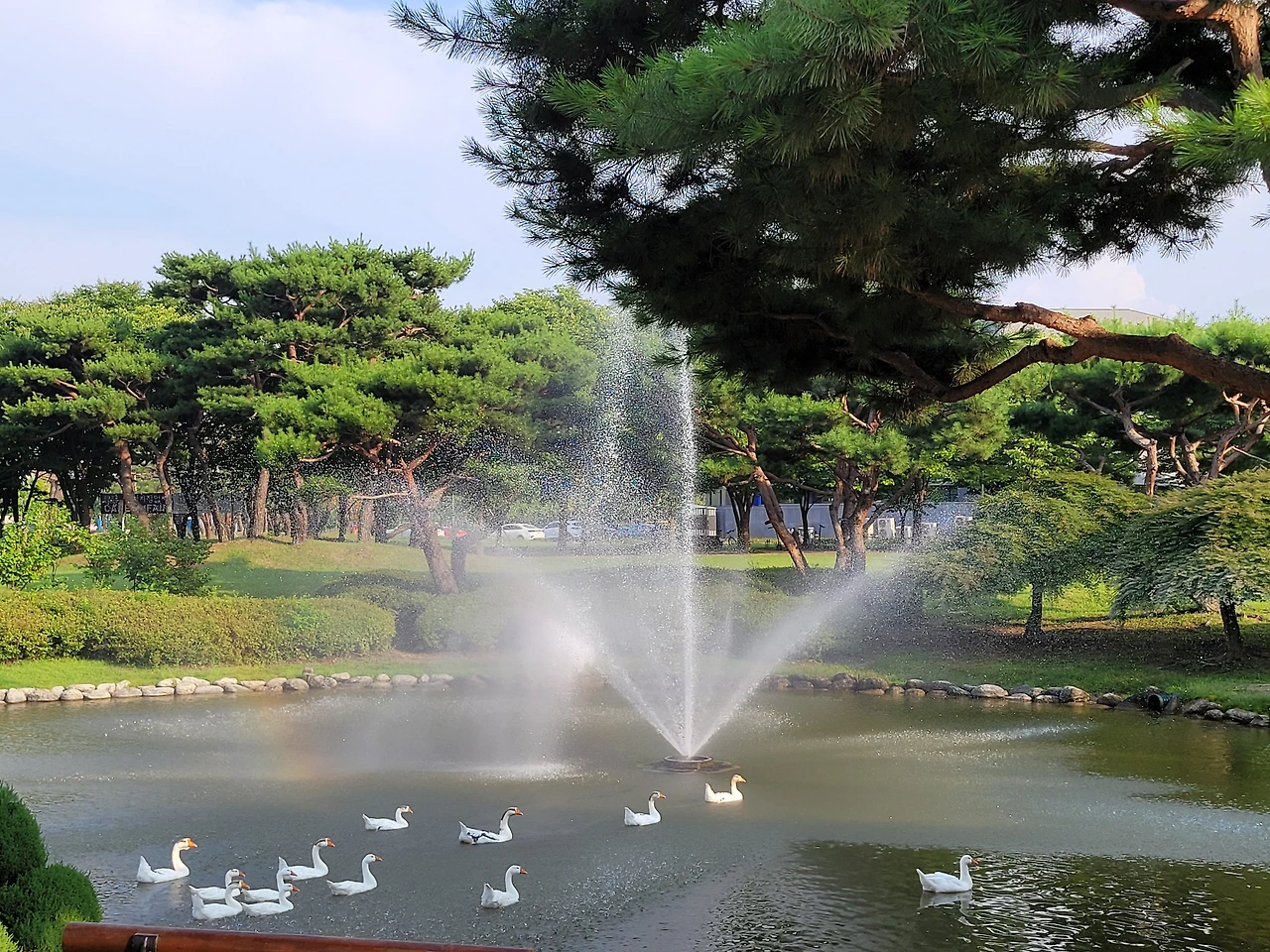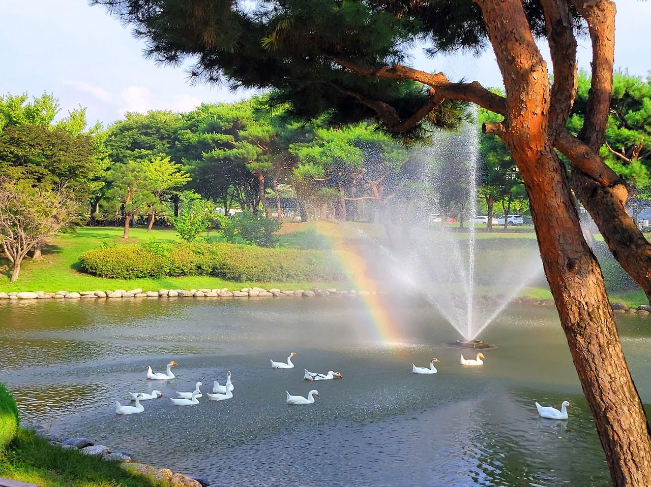 순간에 나타난 분수 옆의 무지개와 오리 가족.