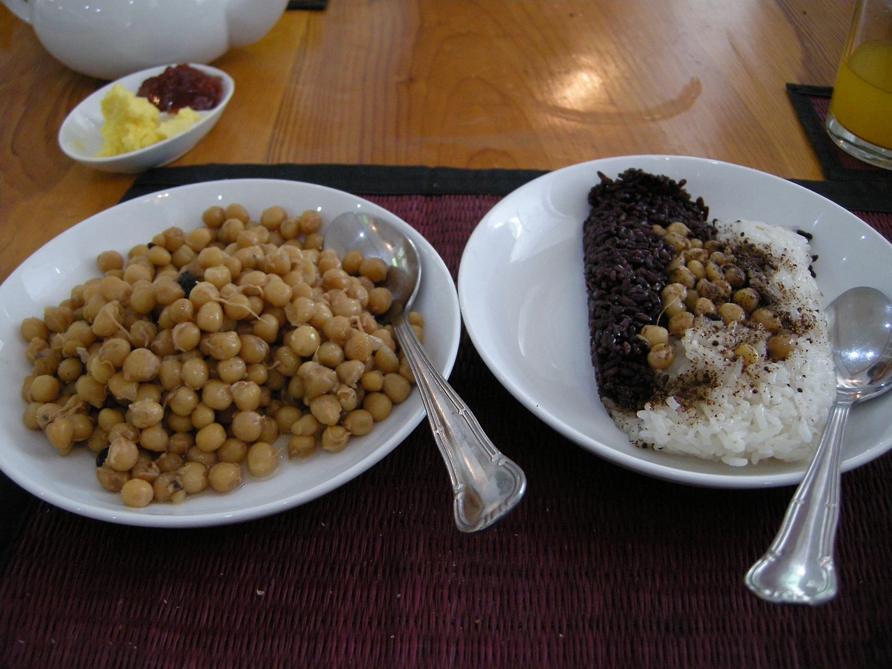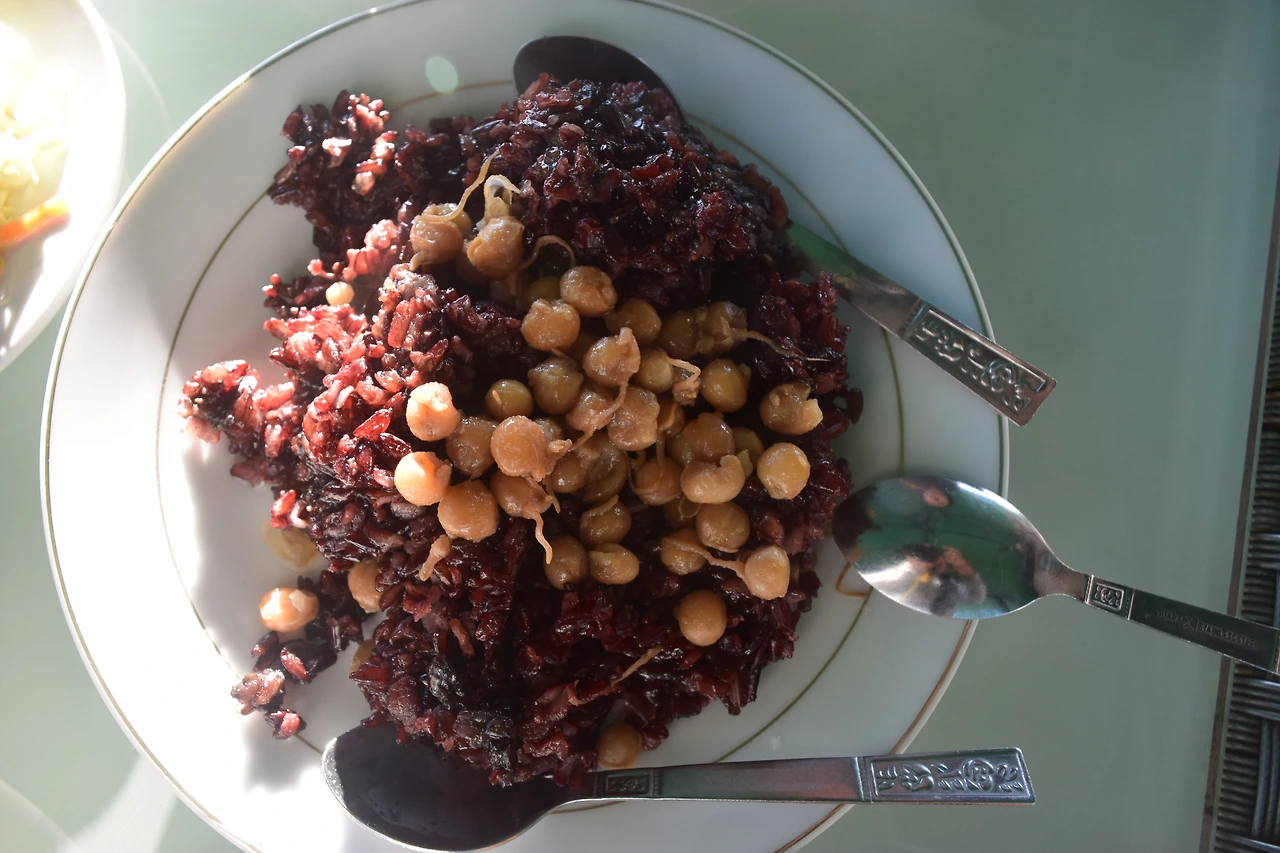 뻬뾱을 놔 먹는 밥에 미얀마 사람들은 소금 간을 해서 먹는다. 찰밥이네, 하며 뭣 모르고 신나게 한 숟가락 뚝, 떠넣었다가 밥이 너무 짜서 깜짝 놀랐었다. 심한 경우, 소금이 자근, 씹히기도 하는데, 삔우린 숙소에서 아침으로 먹은 것이 그러하였다. 숙소 주인 아저씨께 '한국 사람은 밥에 간을 해서 먹지 않아요, 너무 짜요,' 말씀드리니 바로 소금 간하지 않은 밥으로 바꿔주셨다. 늘 그런 것은 아닌데, 밥에 소금 외 기름을 질퍽하게 뿌리는 경우도 있었다. 똑같이 쌀이 주식인 문화권이어도 콩밥을 먹는 방식은 이토록이나 다르다는 게 매우 신선하였다.