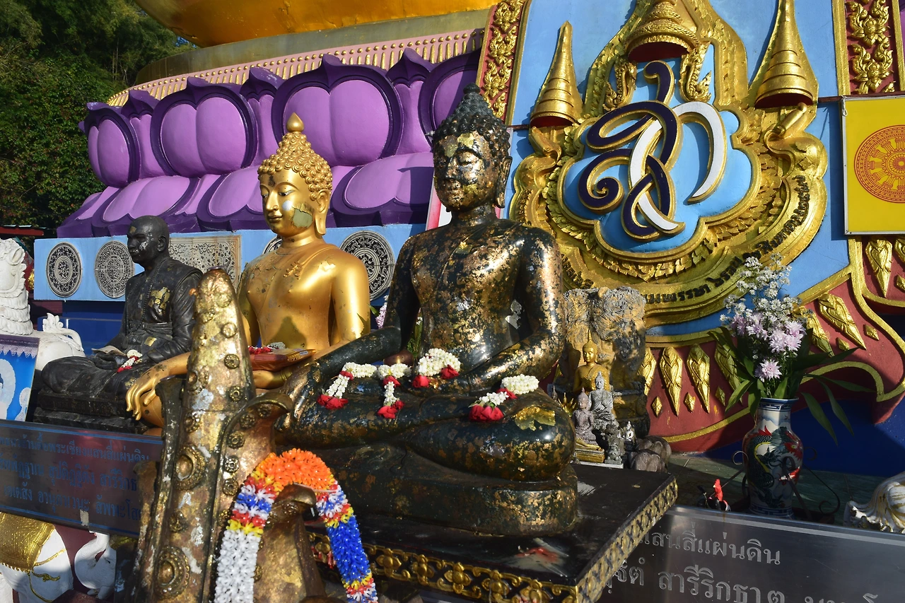 오른쪽 까만색과 금색으로 누덕누덕한 불상은 원래의 금속 색깔이 벗겨져서 그런 것이 아니다. 까만 불상에 금박을 붙여서 그렇게 된 것이다. 이름이 있고 어느 정도 규모가 있는 사원마다 엄청 얇은 금박을 판매하는데, 사람들은 그 금박을 구입하여 불상 표면에 입히면서 간절한 염원을 기도한다. 그렇게 몇 십 년동안 사람들의 간절한 염원을 입은 불상은 원래의 모습을 잃고 마치 머리 한 가닥 삐죽 튀어나온 눈사람 모양 금덩어리가 된다. 흔히 기도발이 잘 받는다고 소문난 사원에서는 그런 눈사람 금덩어리들을 어렵지 않게 볼 수 있다. 종교의 여러 특성 중 기복신앙적 일면이 가장 잘 드러난 모습이랄까.